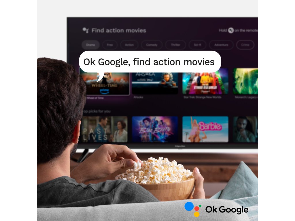 A Kruger&Matz KM0240FHD-SA TV a megfelelő tartalom megtalálásának útikalauzává válik. Nyomja meg a távirányítón található hangalapú keresés gombot, hogy feltegyen egy kérdést, vagy kérje a megnézni kívánt filmet, és a válaszokat közvetlenül a képernyőn kapja meg.