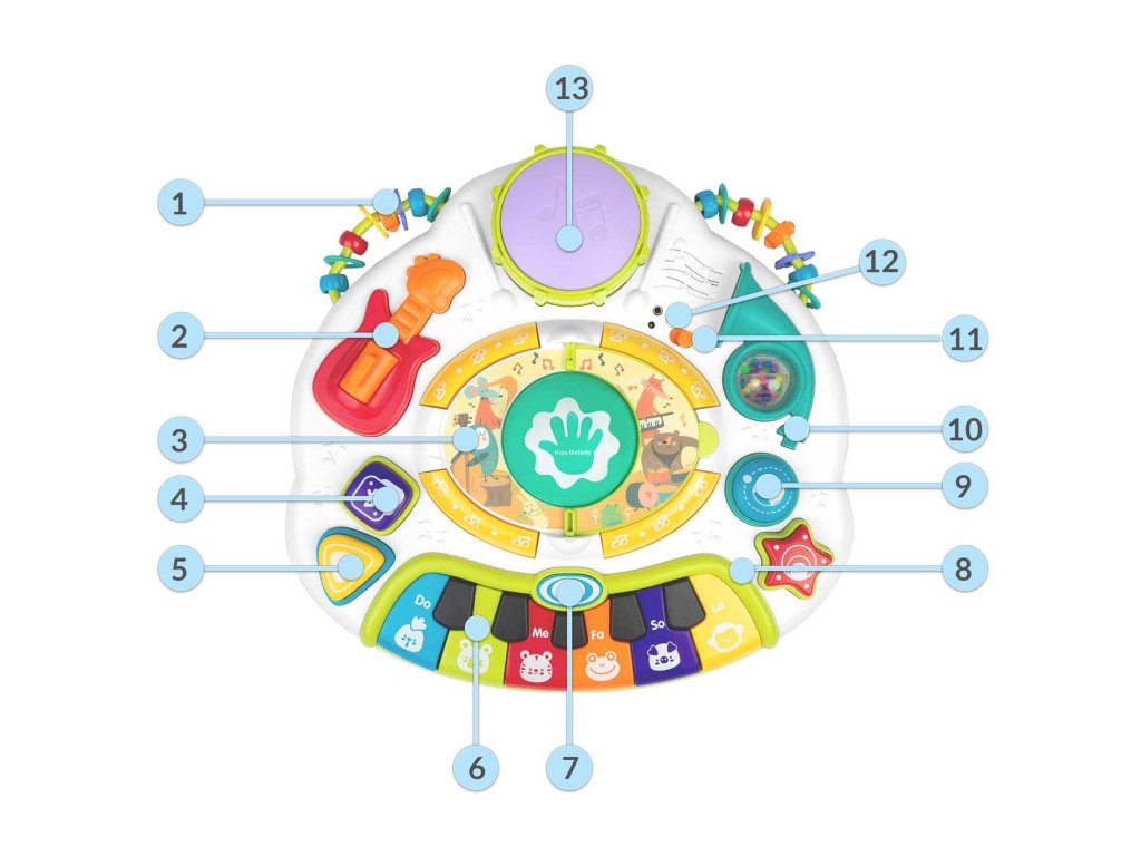 4. Bluetooth gomb - tartsa lenyomva 3 másodpercig a Bluetooth aktiválásához (eszköz neve: Kids Melody),