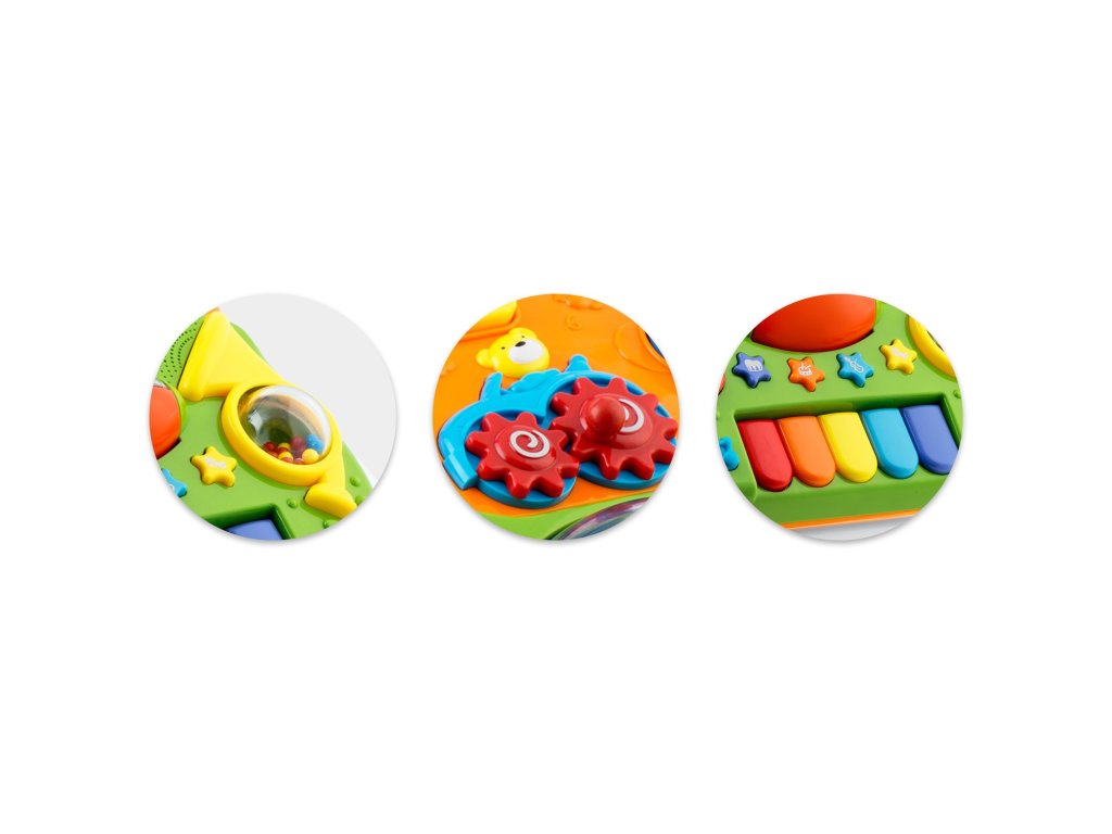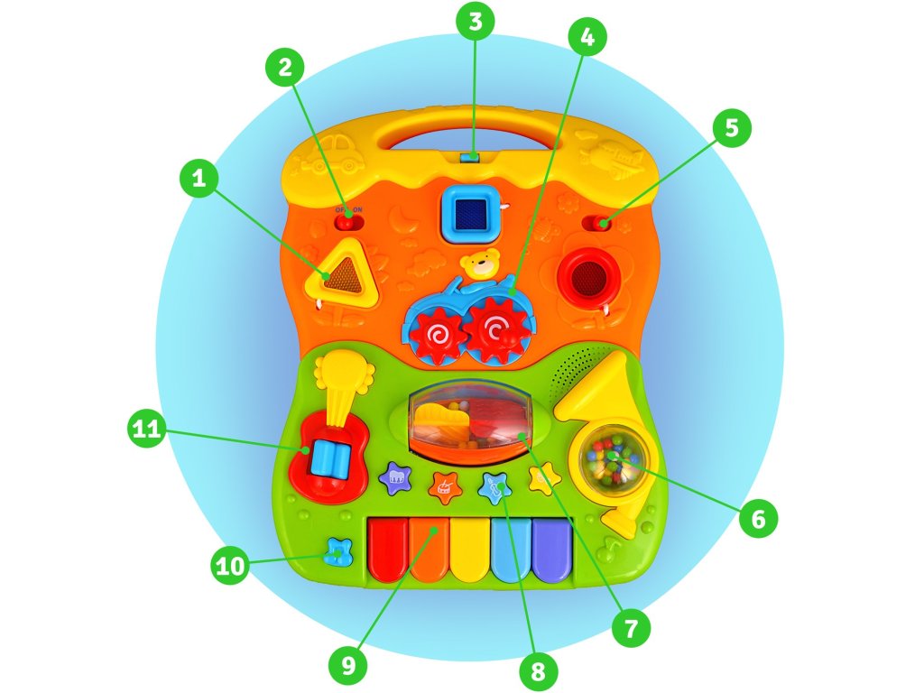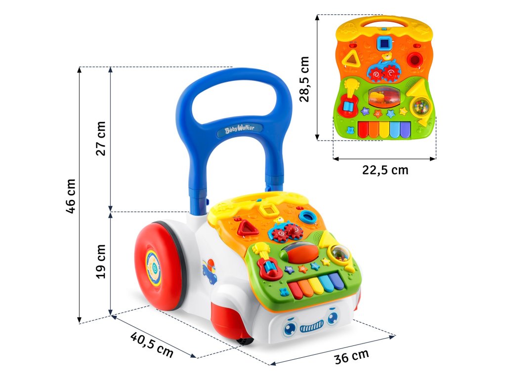 A járástanulás mellett a termék ideális a színek és a formák tanulására. Akivehető panel (a panel eltávolításához nyomja meg a kialakítás alján található gombot a retesz kioldásához) oktatási táblaként használható.