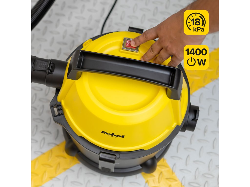 Erőteljes és megbízható: ez a Rebel Tools termékcsalád nedves és száraz ipari porszívója. Széles körű funkcionalitásának és nagy, 1400 W-os teljesítményének köszönhetően nemcsak otthon, hanem autó- vagy műhelyporszívóként is használható. A 18 kPa magas nyomásnak és a 41 mm-es tömlőátmérőnek köszönhetően a szennyeződések széles köre alaposan megtisztítható.
