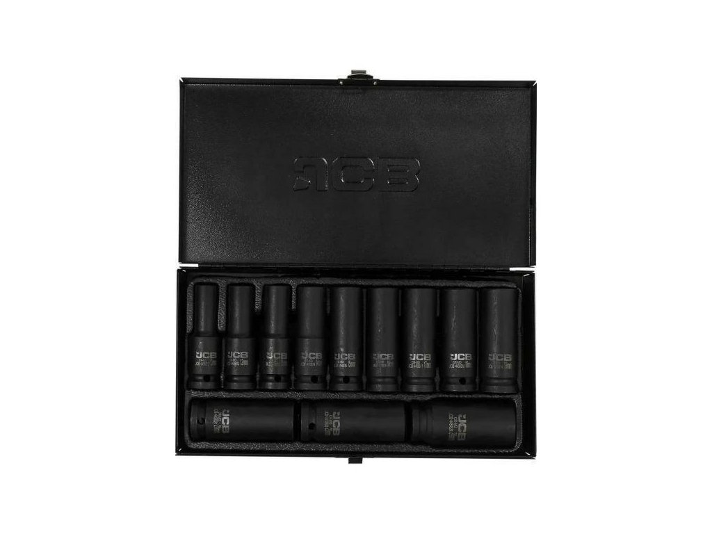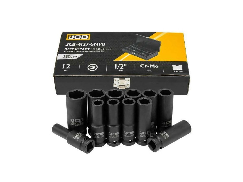 Készlet 12 mély ütős dugókulcs JCB Tools JCB-4127-5MPB egy professzionális eszköz, amely intenzív műhelymunkákhoz készült, beleértve a csavarok és anyák beszerelését és eltávolítását ütős kulcsok használatával.