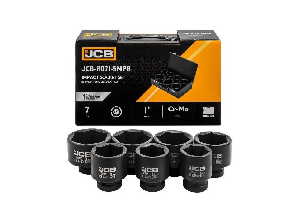 A JCB-8071-5MPB egy teljes készlet 7 ütésálló fejegységet tartalmaz, amely a legnagyobb igénybevételnek is megfelel műhelyekben, autószervizekben és szerelési munkák során. Magas szilárdságú Cr-Mo (króm-molibdén) acélból készült, a fejegységek kiemelkedő ellenállást nyújtanak a töréssel, ütésekkel és deformációkkal szemben, még pneumatikus vagy elektromos kulcsokkal végzett munka során is.