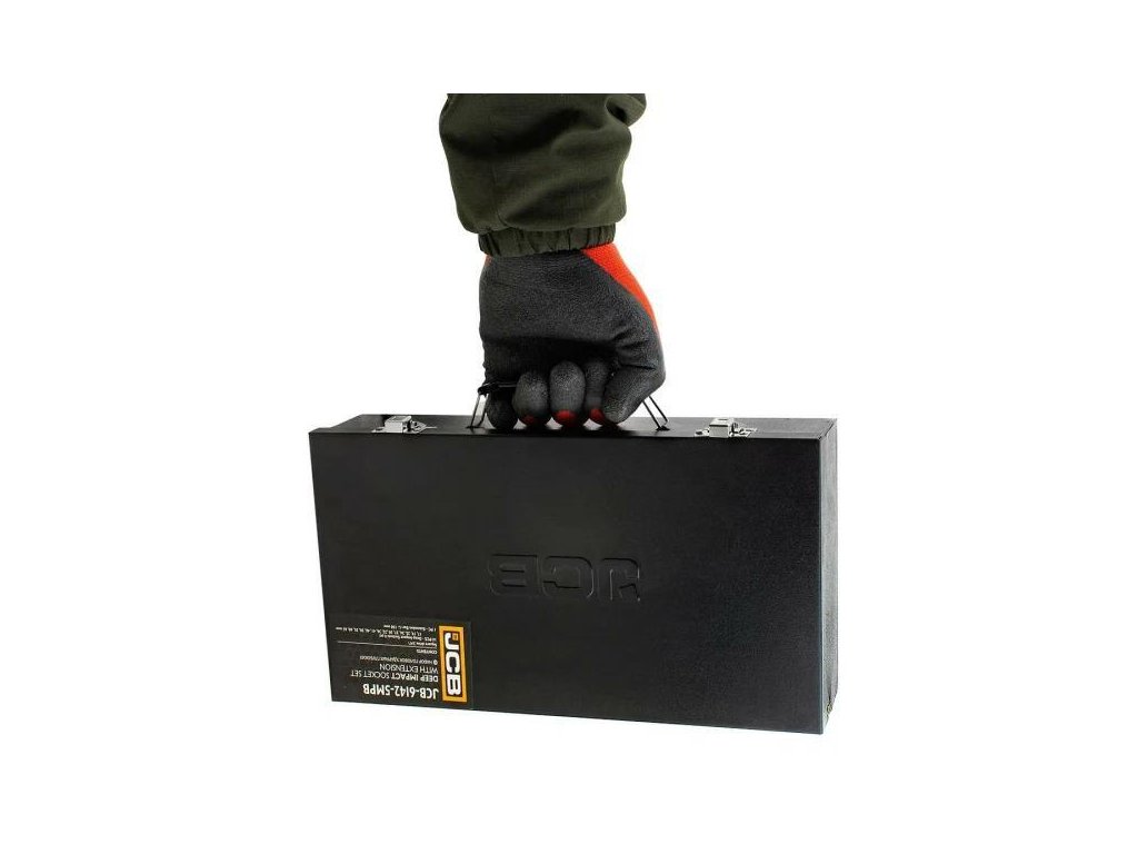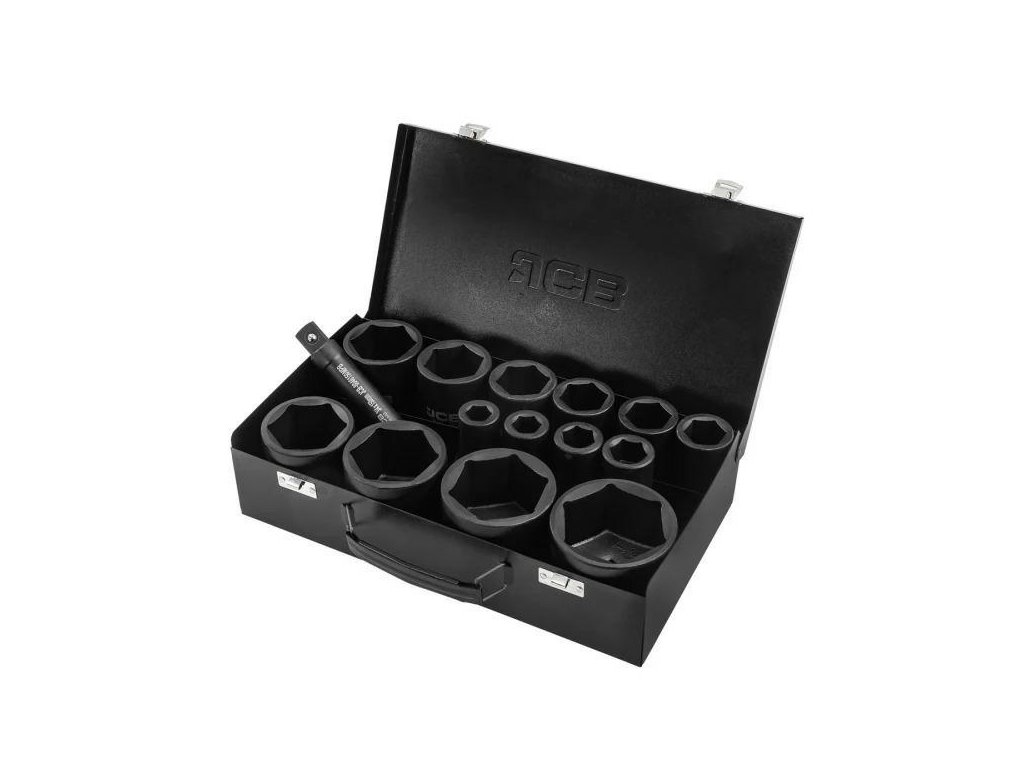 Készlet 14 mély ütésálló dugó JCB Tools egy professzionális szerszám, amely intenzív műhelymunkákra készült, beleértve a csavarok és anyák beszerelését és eltávolítását ütésálló kulcsok segítségével.
