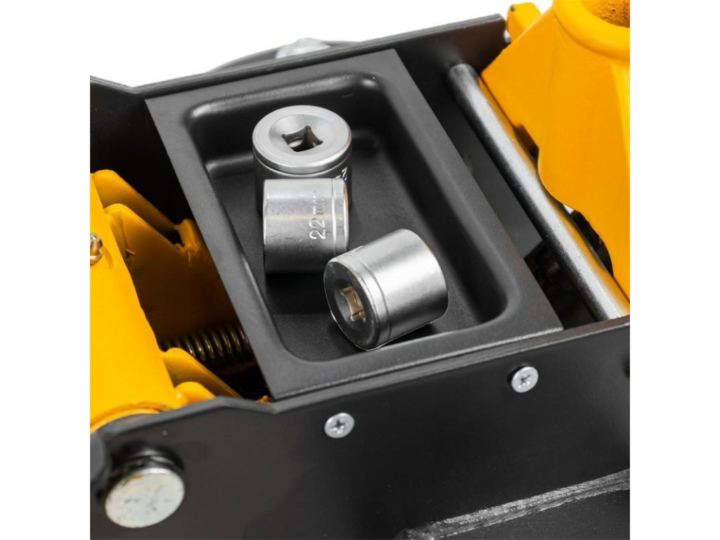 Ergonomikus, hosszú fogantyú állítható lehetővé teszi a emelési és süllyesztési folyamat pontos irányítását – anélkül, hogy hirtelen jármű leesésének kockázatával kellene számolnunk. A beépített biztonsági szelepek megakadályozzák a hidraulikus rendszer túlterhelését.