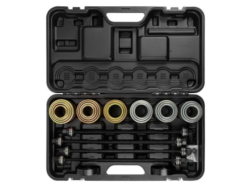 Professzionális 26 részes készlet, amely hüvelyekkel, csapágyakkal és lengőkarokkal való munkára készült, nélkülözhetetlen szerszám minden autószerelő műhelyben és mechanikai szervizben. Sokoldalúságának és precíz kivitelezésének köszönhetően gyors, biztonságos és hatékony javításokat tesz lehetővé a felfüggesztések és az összeszerelő rendszerek számára, hidraulikus prés alkalmazása nélkül.