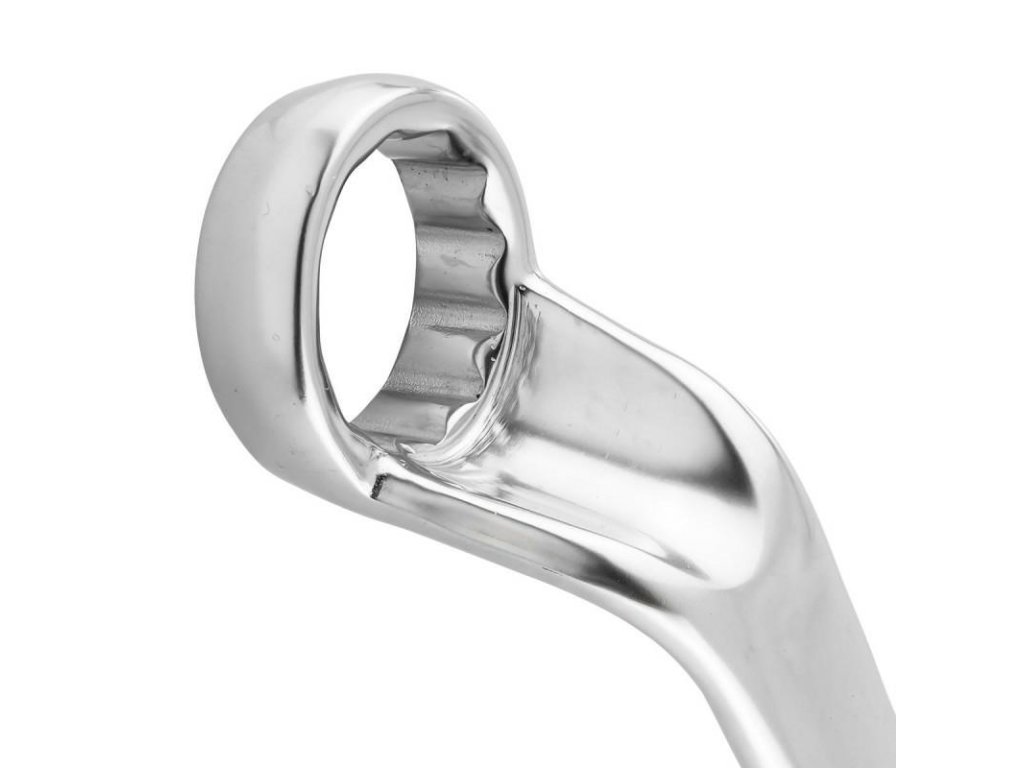 Kétoldalas 75°-os elhajlítású vékony kulcs méretekkel 24x27 mm egy megbízható kéziszerszám, amelyet szűk helyeken és nehezen hozzáférhető menetes csatlakozásoknál végzett munkákhoz terveztek. 12-szögű profillal és 75°-os hajlítással mindkét végén a kulcs magas munkakonfortot biztosít, és lehetővé teszi a könnyű használatot még azokban a helyeken is, ahol a standard kulcsok nem működnek.
