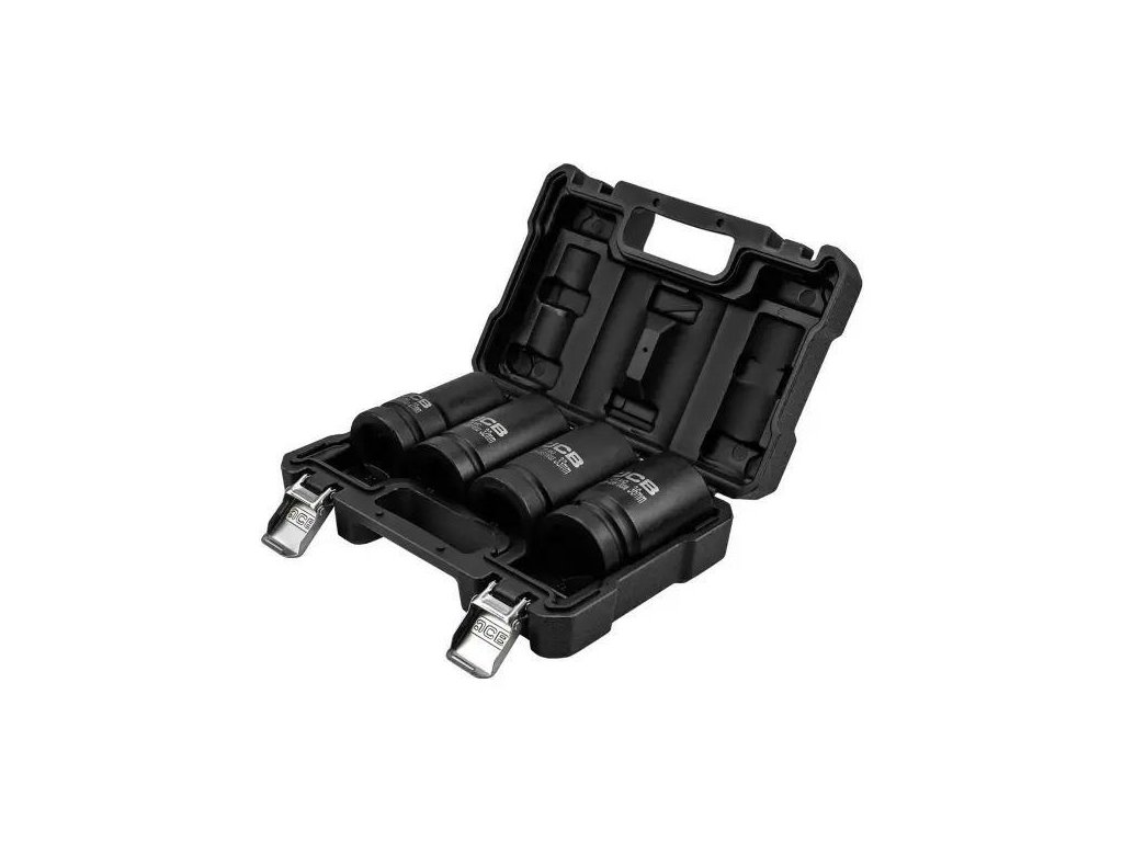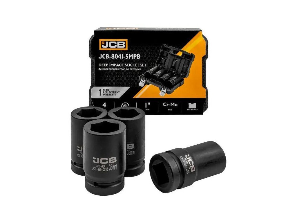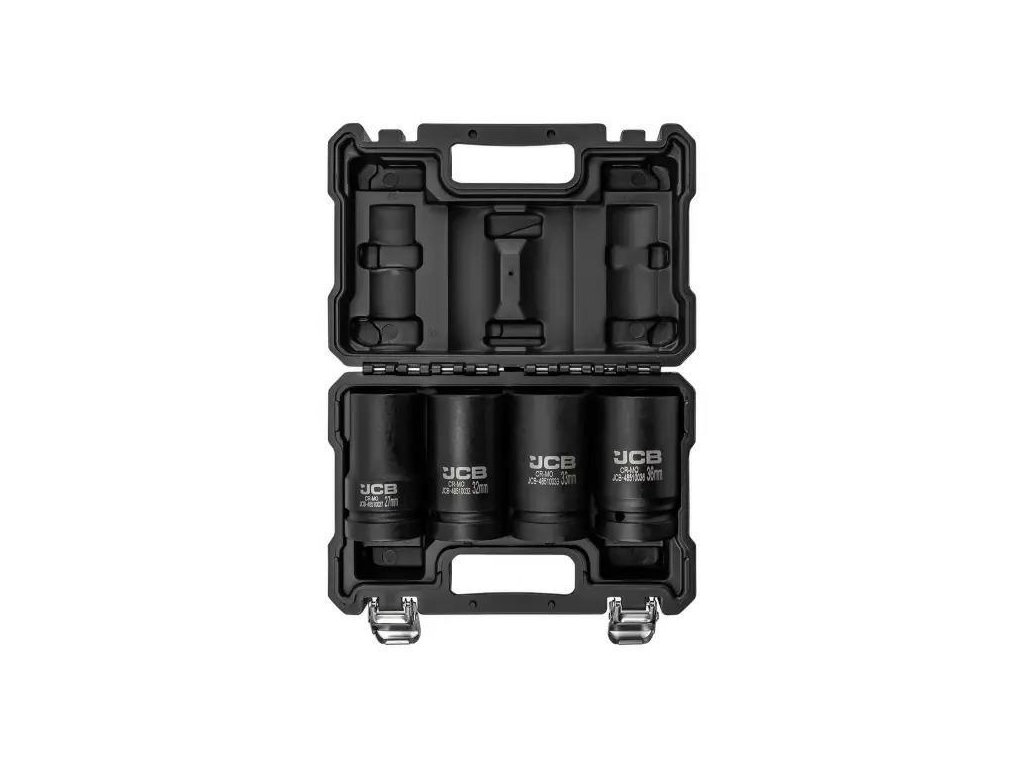 Készlet 4 mély ütköző dugóval JCB Tools a professzionális eszköz, amely intenzív műhelyi munkákhoz készült, beleértve a csavarok és anyák beszerelését és eltávolítását ütköző kulcsok használatával.