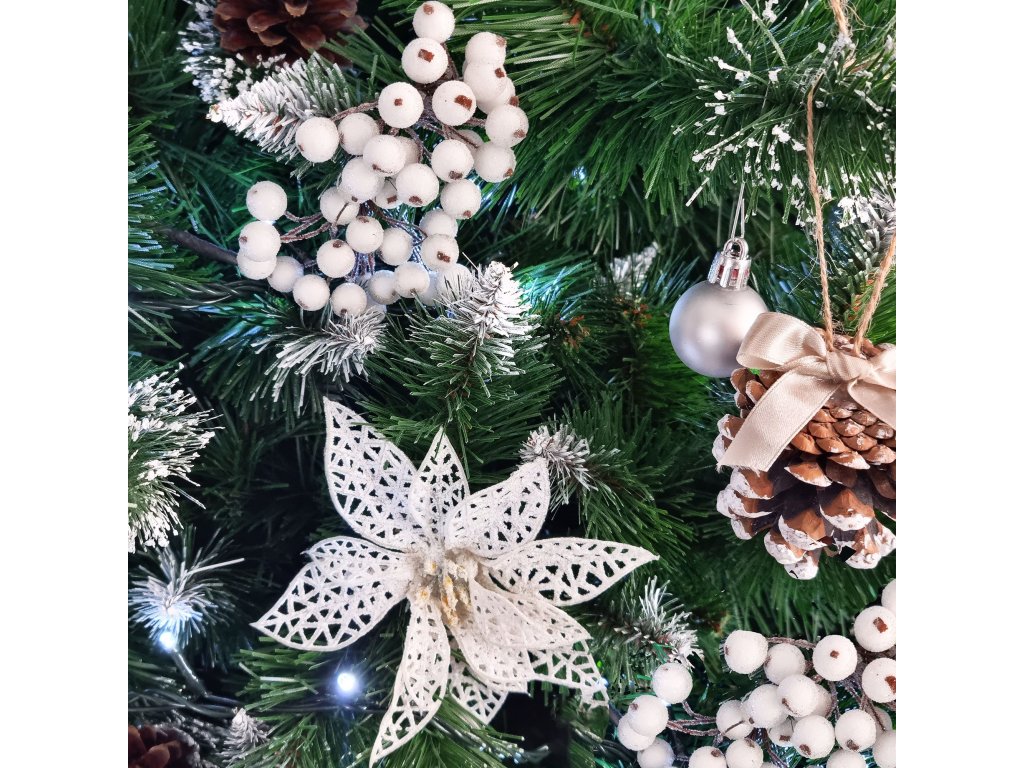 Továbbá: természetes fenyőtobozok, matt hatás az ágakon (fehér rész, fehér csillogás)