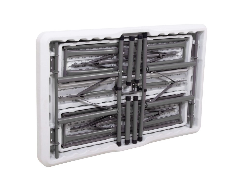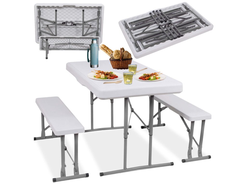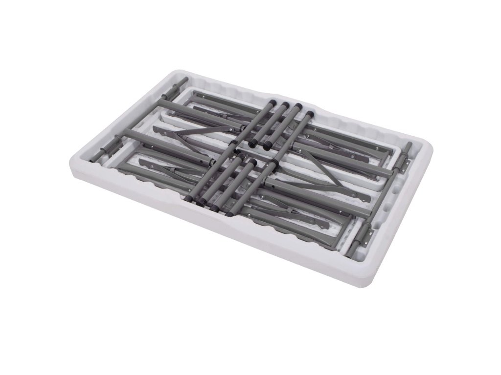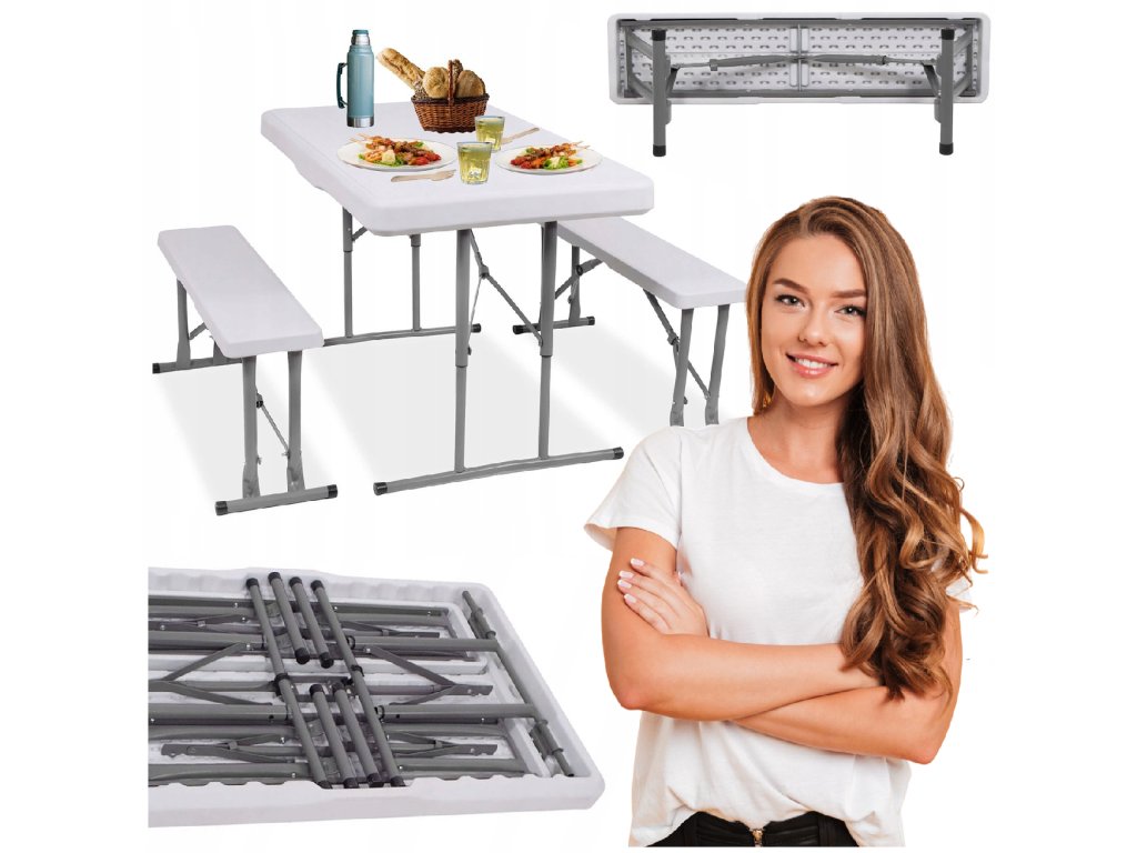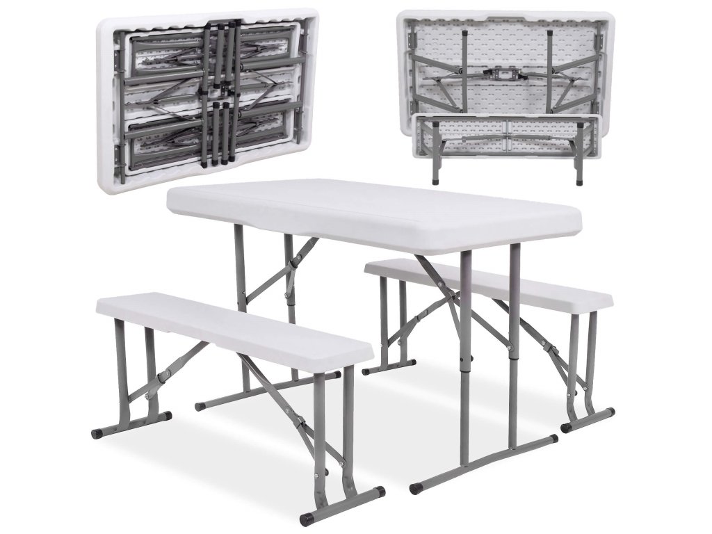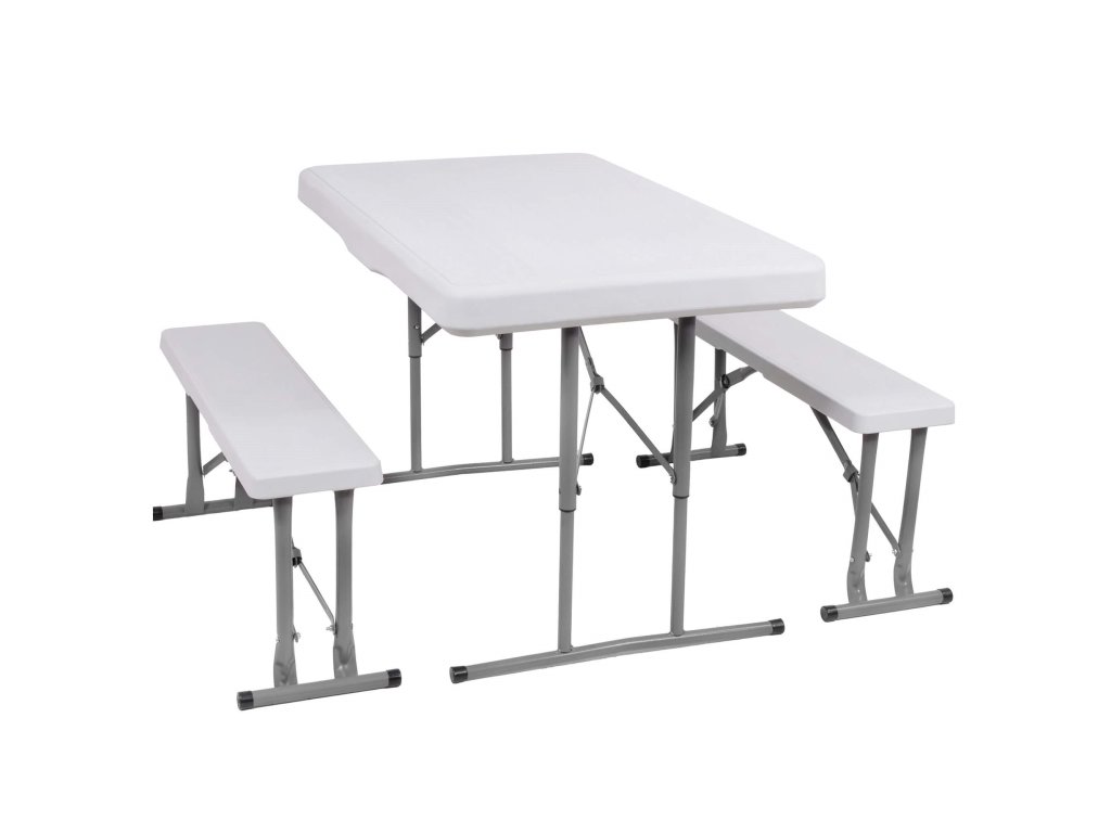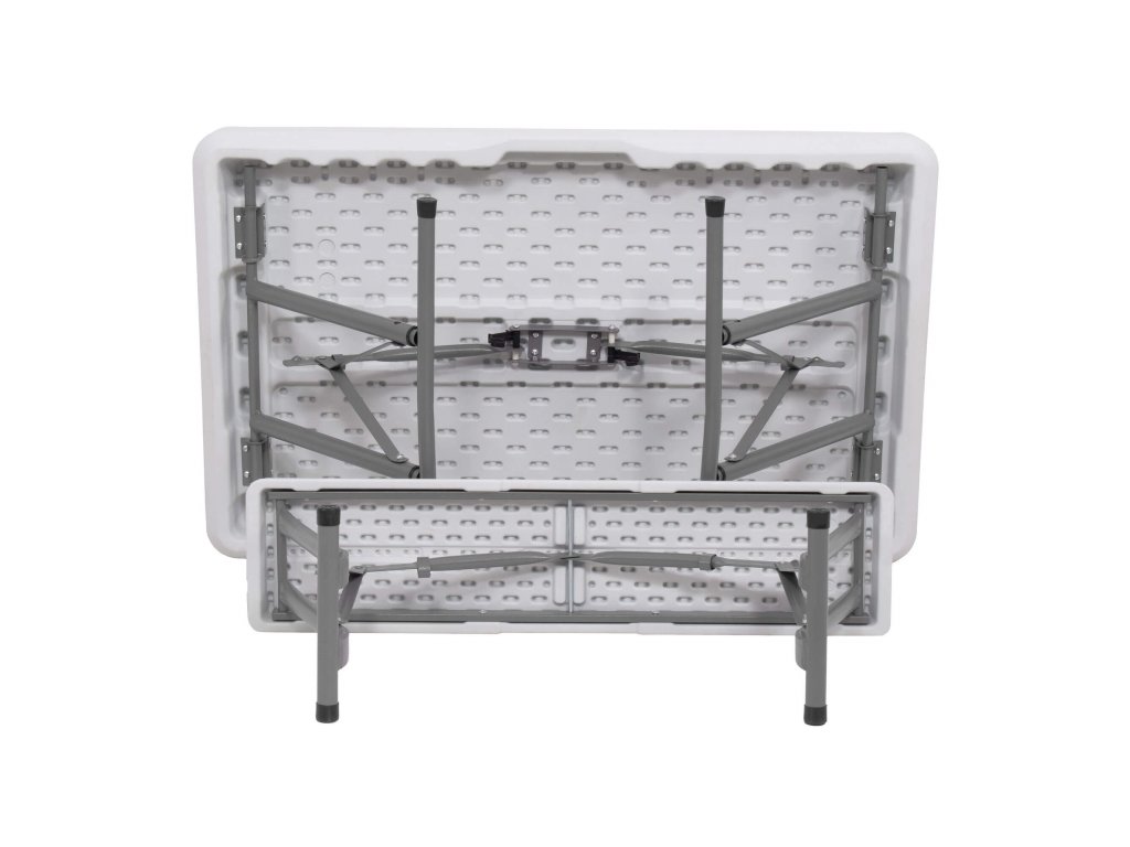 - Az összecsukott padok teljes egészében az összecsukott asztal belsejében vannak elrejtve, így az egész összeállítás összecsukott méretei megegyeznek az összecsukott asztal méreteivel