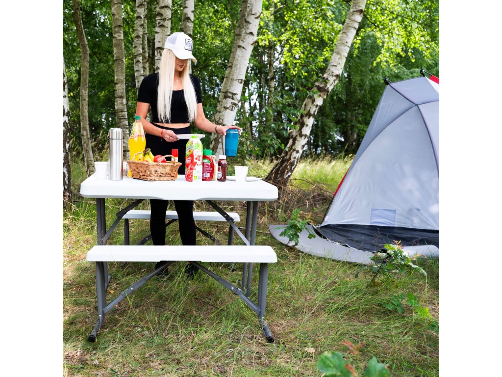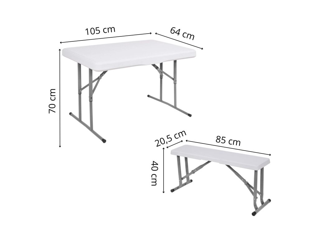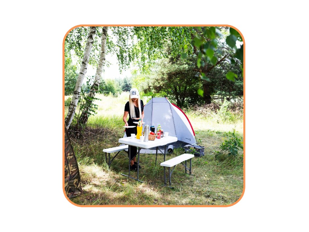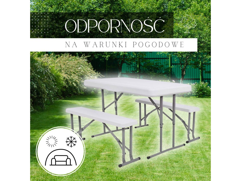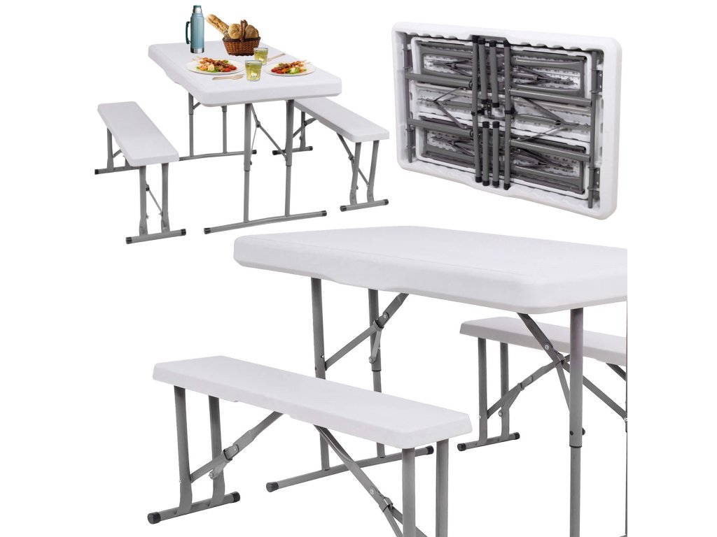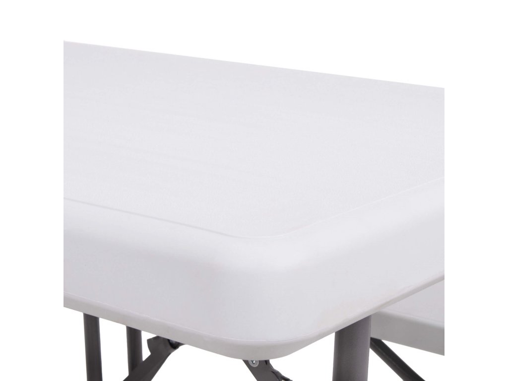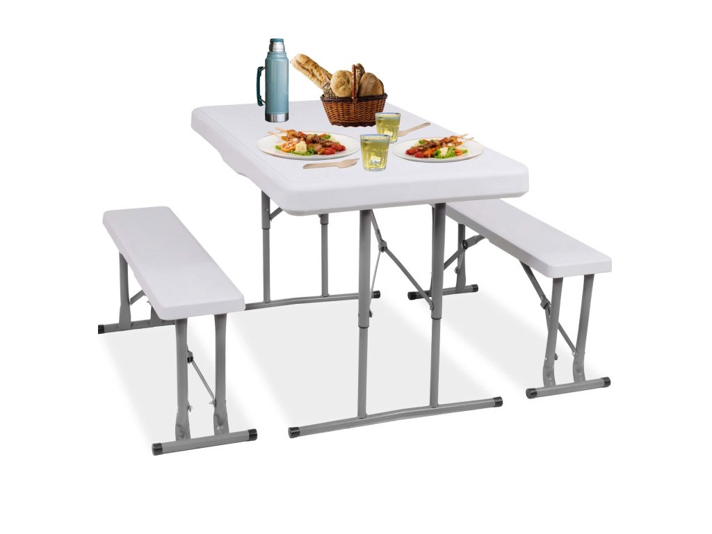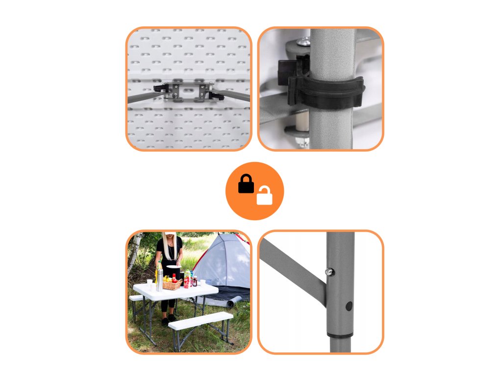 - Az összecsukott padok teljes egészében az összecsukott asztal belsejében vannak elrejtve, így az egész összeállítás összecsukott méretei megegyeznek az összecsukott asztal méreteivel
