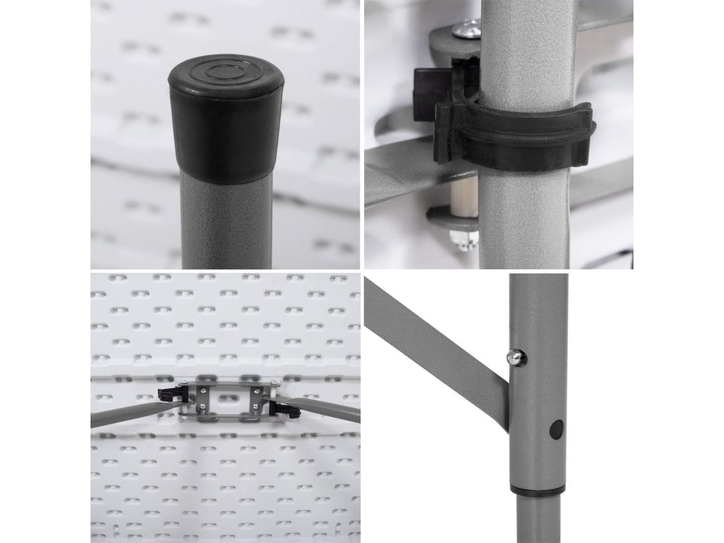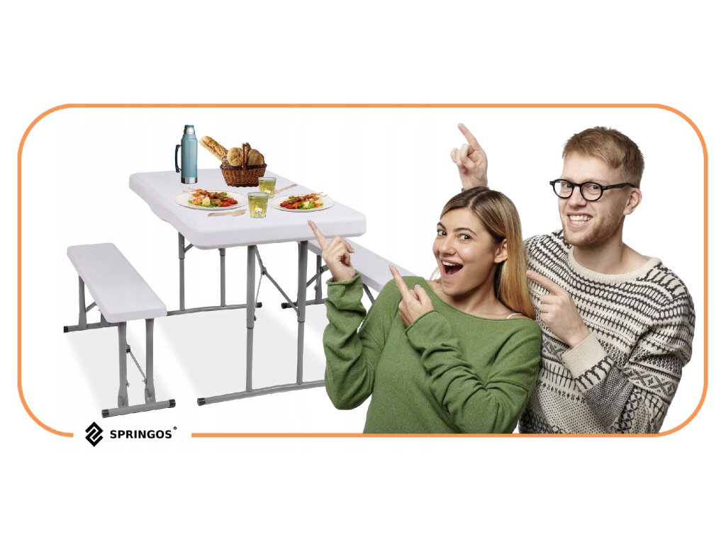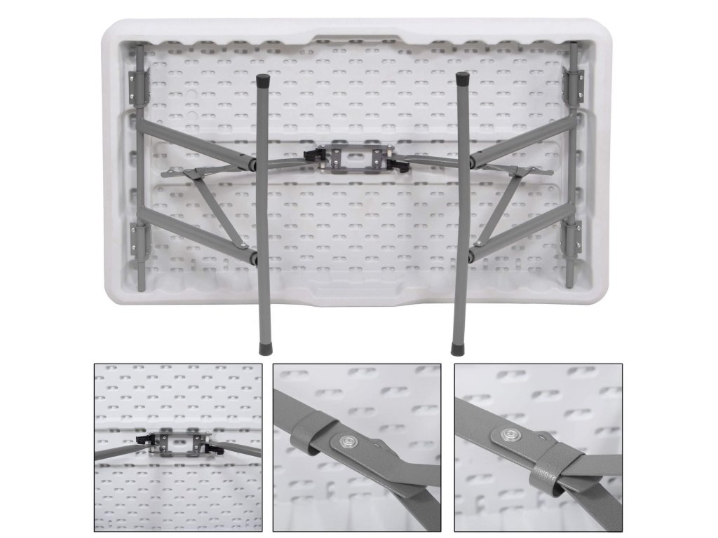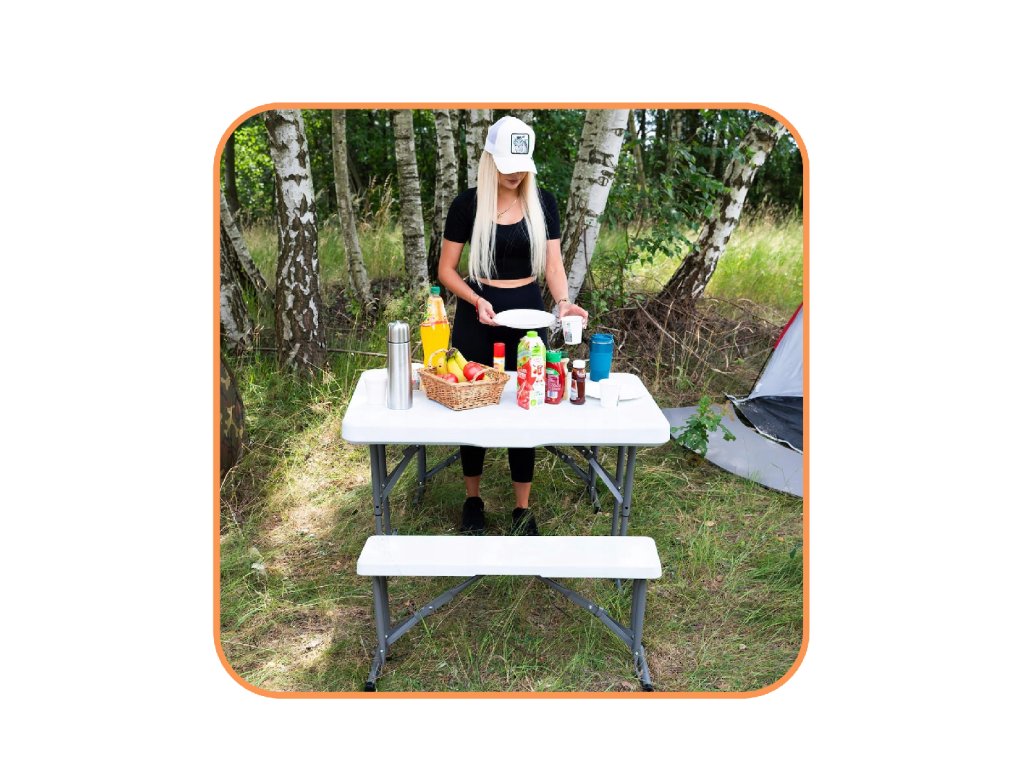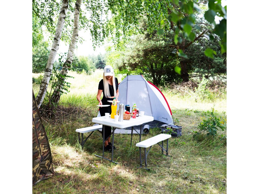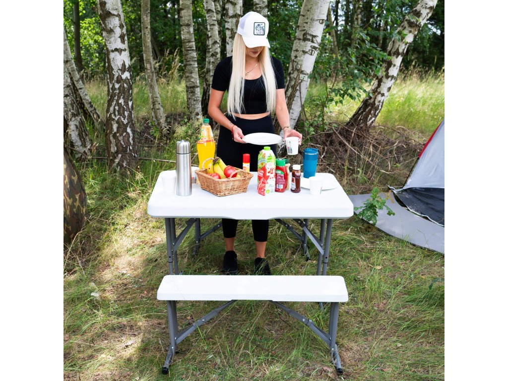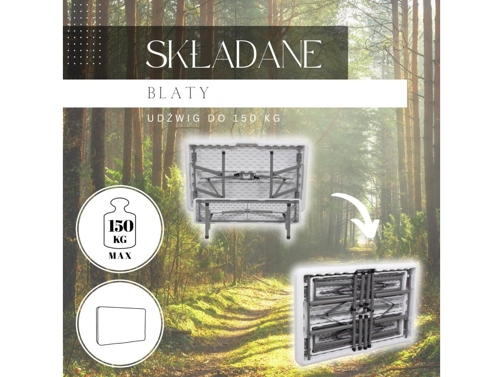- Az összecsukott padok teljes egészében az összecsukott asztal belsejében vannak elrejtve, így az egész összeállítás összecsukott méretei megegyeznek az összecsukott asztal méreteivel