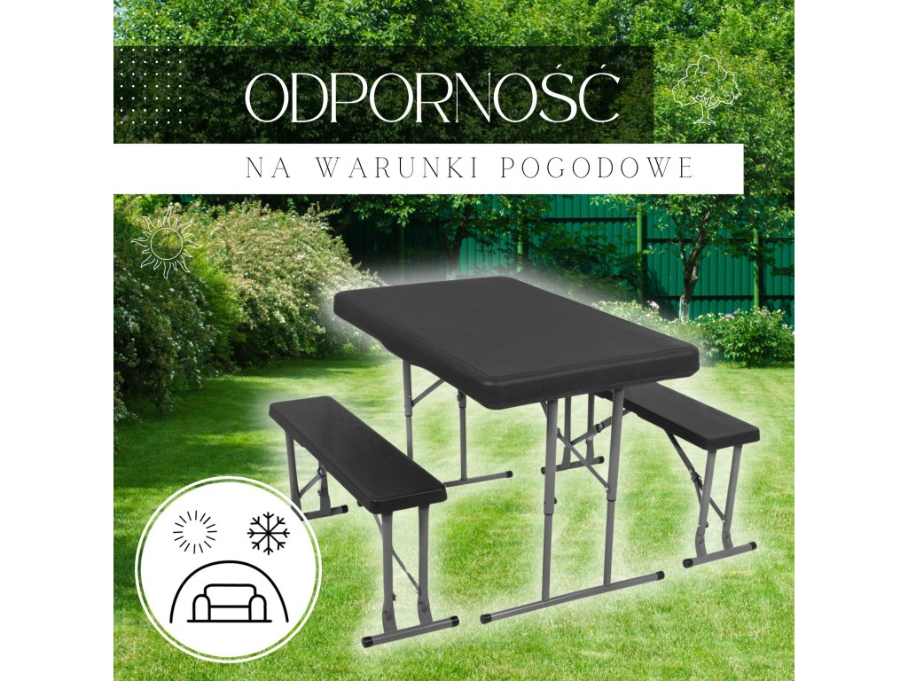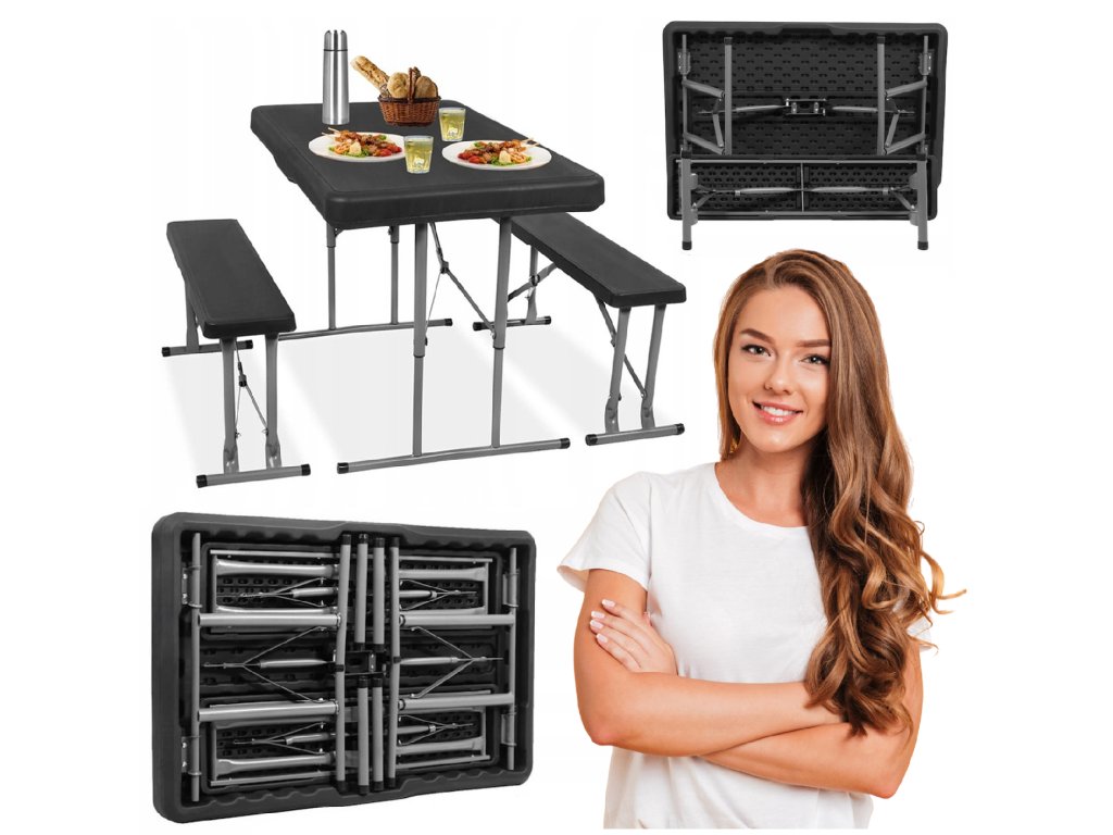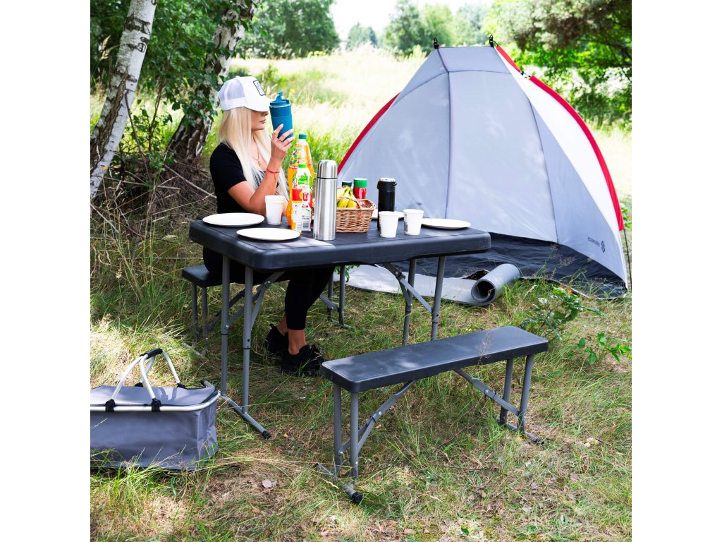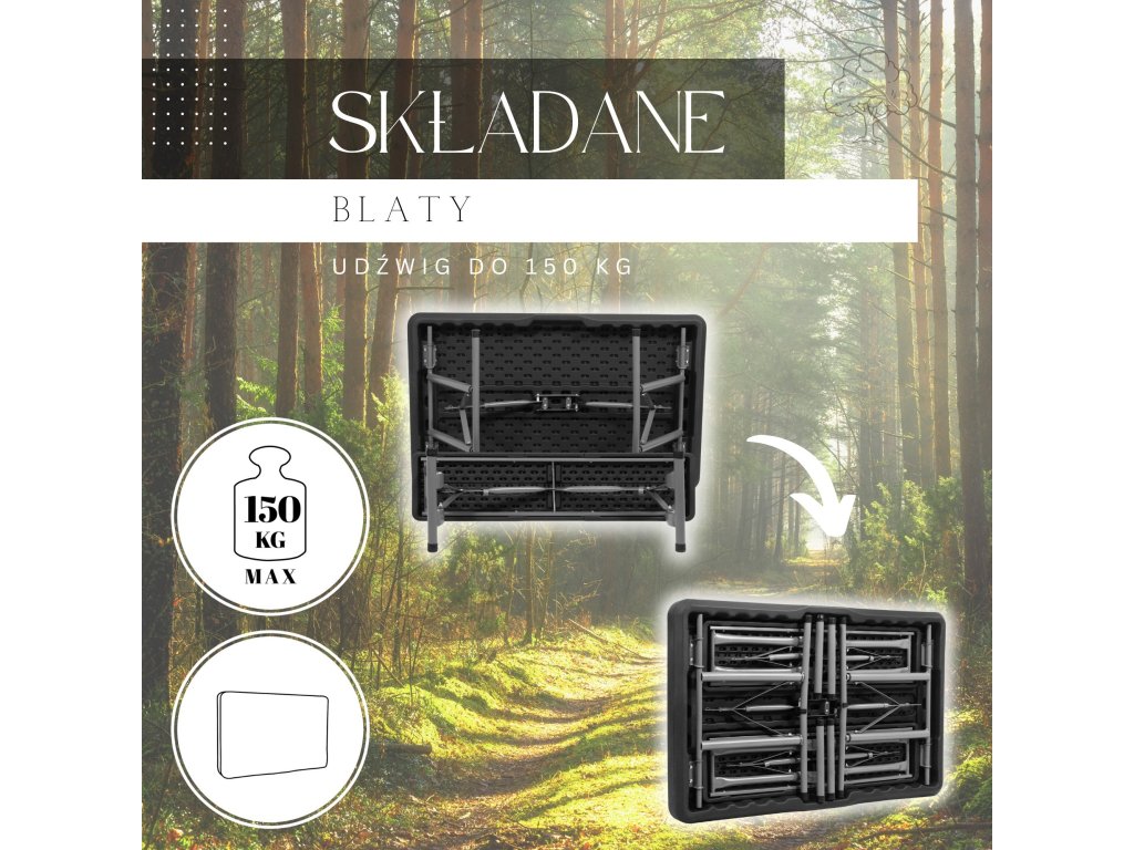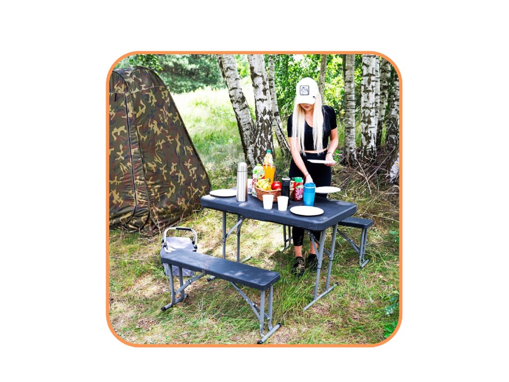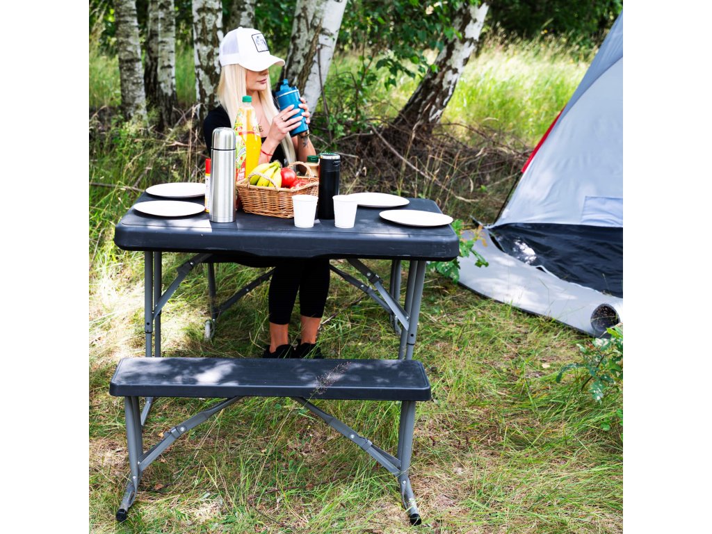 - Az összecsukott padok teljes egészében az összecsukott asztal belsejében vannak elrejtve, így az egész összeállítás összecsukott méretei megegyeznek az összecsukott asztal méreteivel