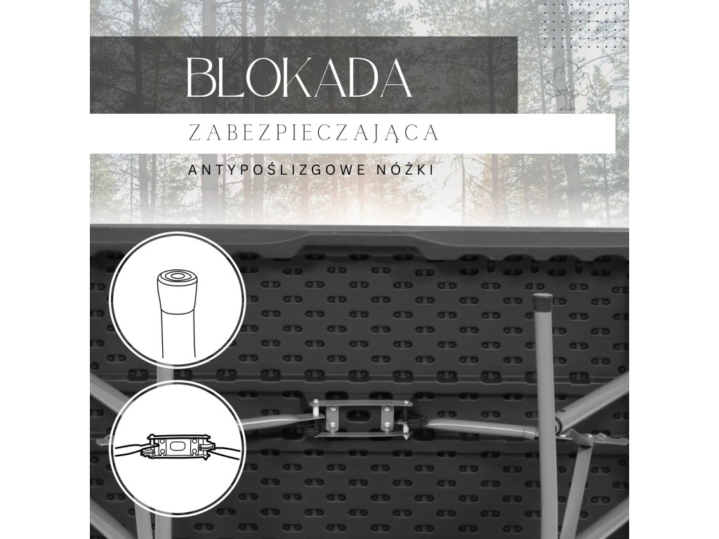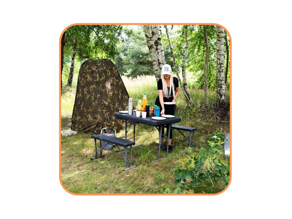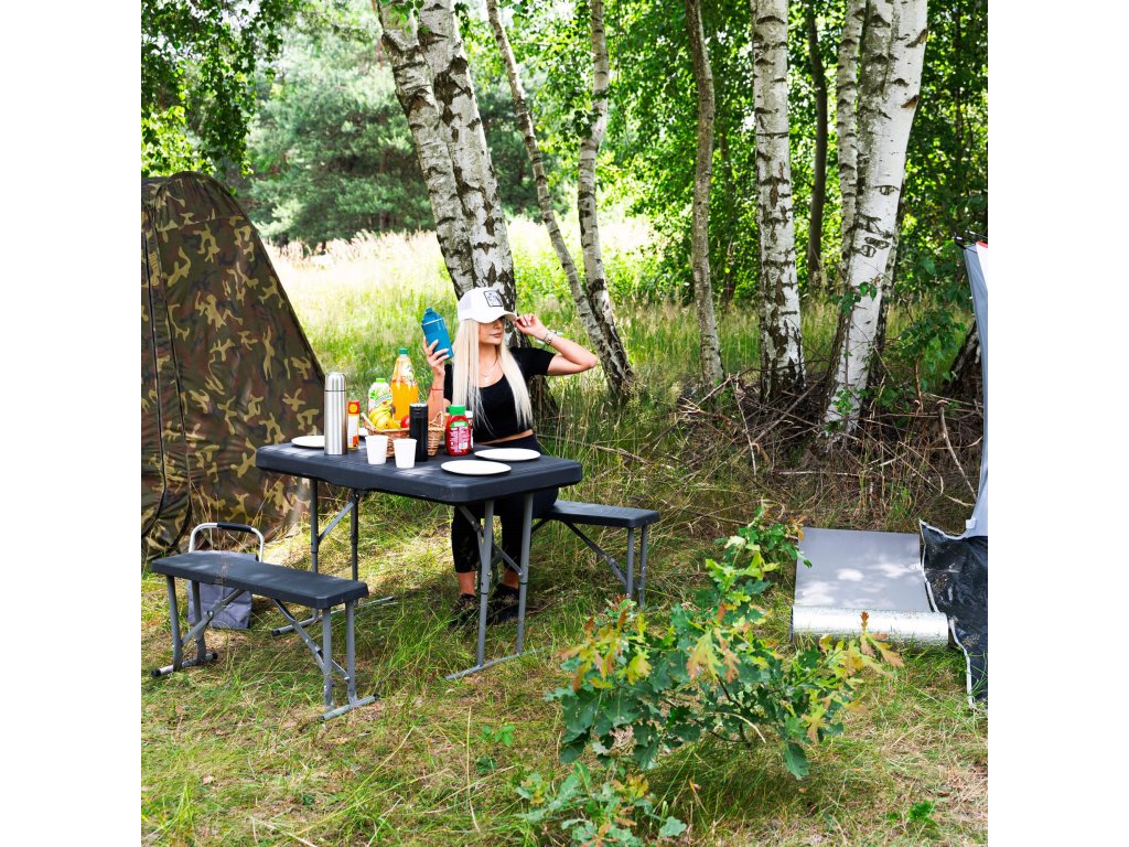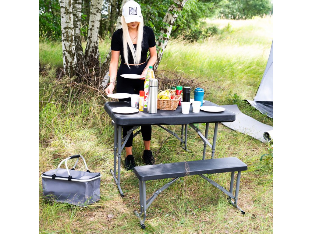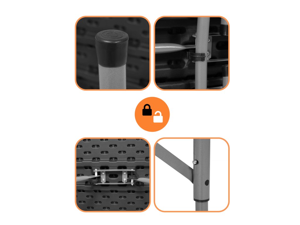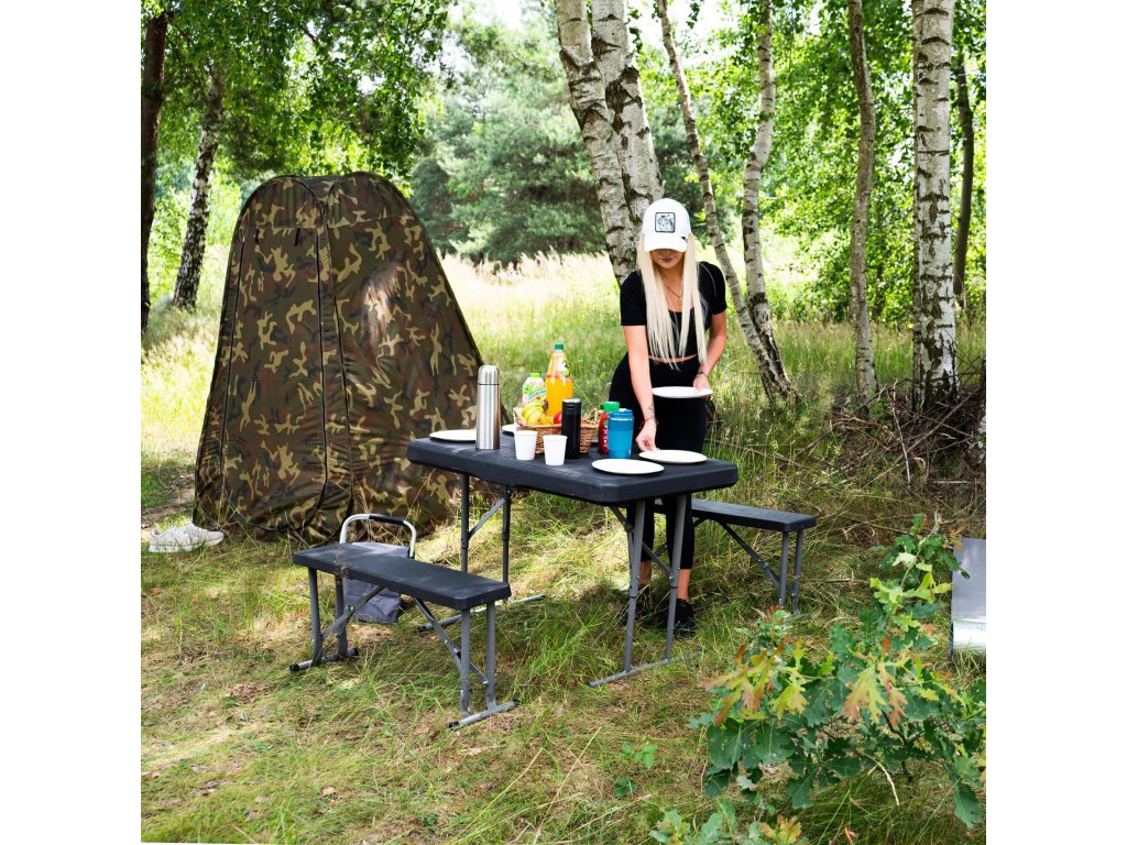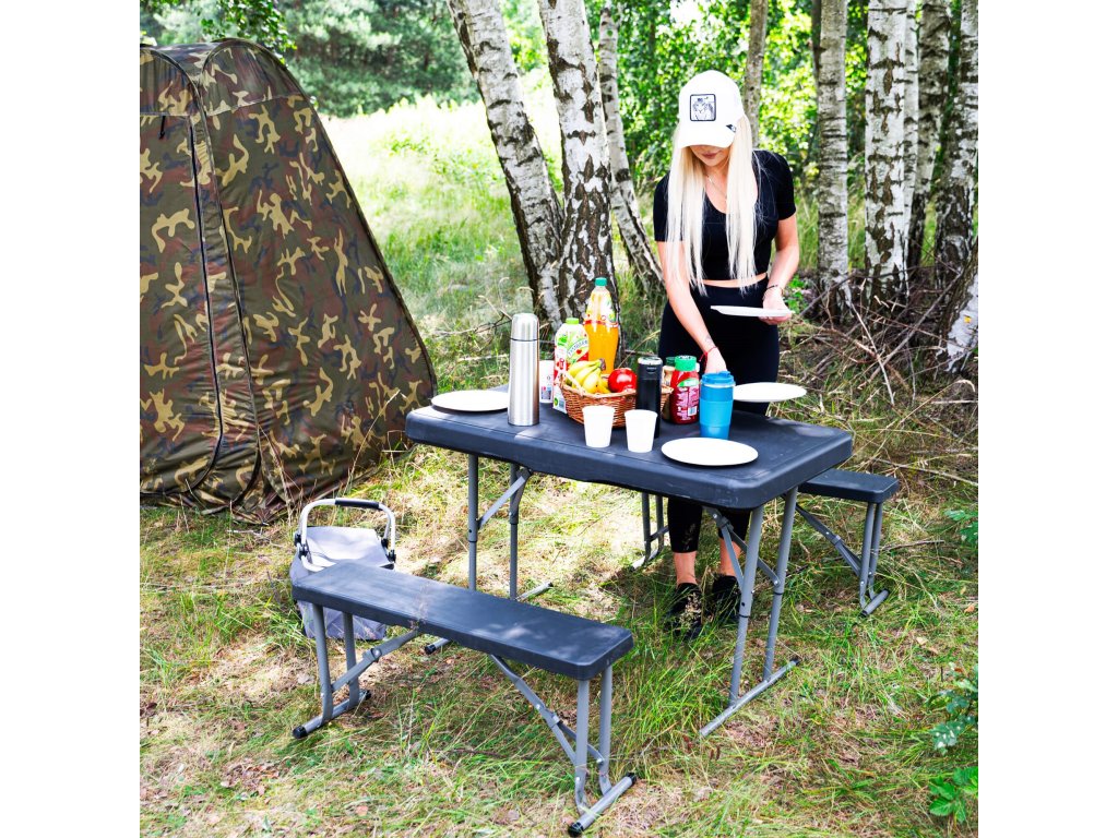 - Az összecsukott padok teljes egészében az összecsukott asztal belsejében vannak elrejtve, így az egész összeállítás összecsukott méretei megegyeznek az összecsukott asztal méreteivel
