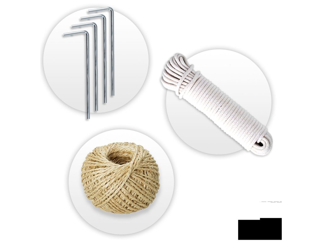 INFRAJÁTÉK: Ingyenes tartozékok: 5 bot a növények egyengetésére, 100 m juta kötél, 4 cövek, 4x260 cm fehér kötél a kifeszítéshez.
