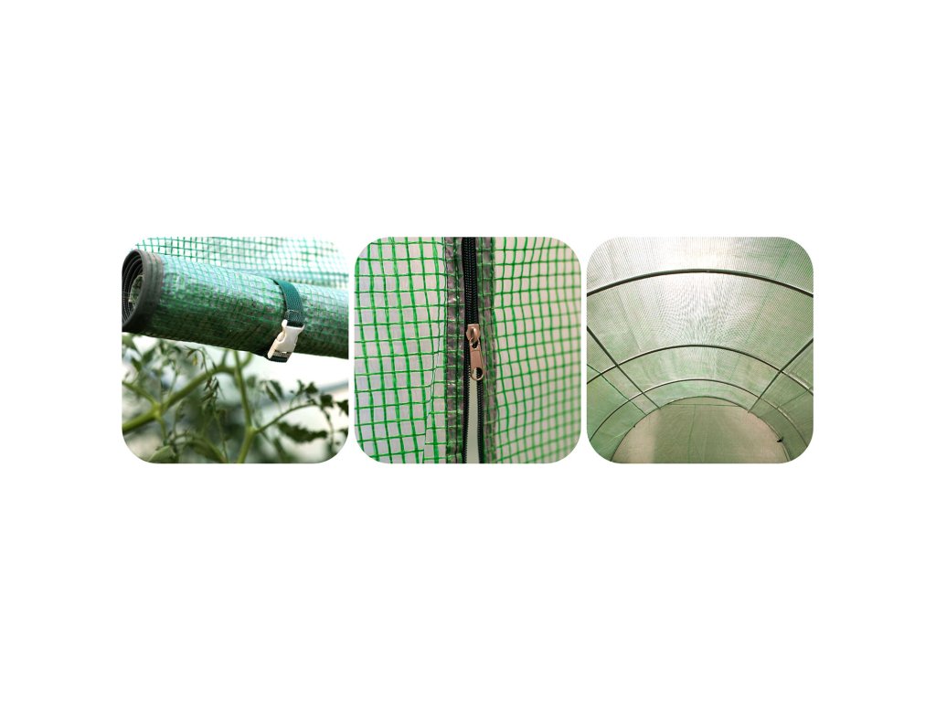 - további védelmet nyújt a széllel való felemelés ellen, ha a sátor alján található "szoknyát" földel fedjük, a fóliát cipzárral nyithatjuk.