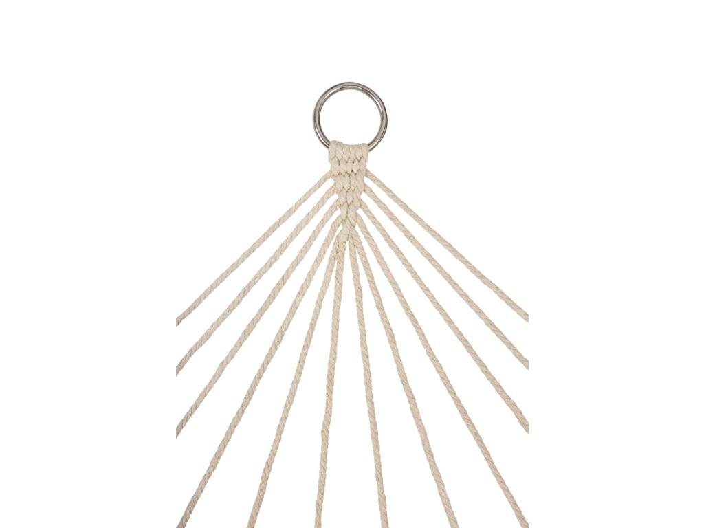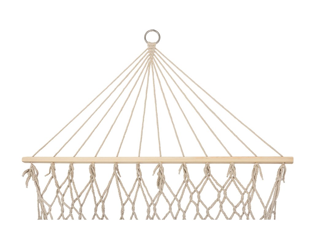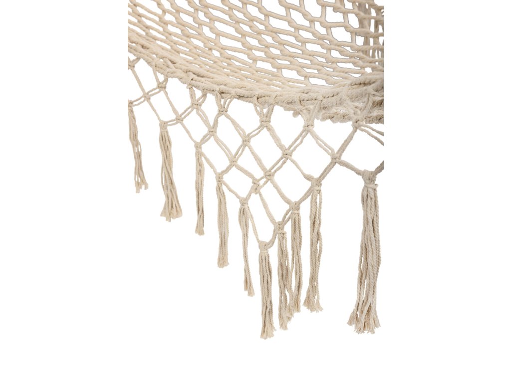 A hintaháló sűrűn szőtt pamutszálból (65%) készült, amely magas tartósságot biztosít. Gond nélkül elbír akár 250 kilogramm súlyt. A világos bézs szín és a bojtok az széleken elegáns megjelenést kölcsönöznek neki, amely tökéletesen illeszkedik bármilyen kerti környezetbe. A hintaháló egy 100 cm széles fa keretre van felfüggesztve, amely elegendő stabilitást és kényelmet biztosít. Összetekerve nagyon kevés helyet foglal, így könnyen tárolható.