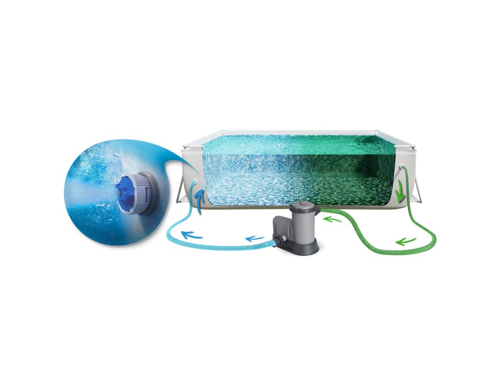 - Az eszköz együttműködik a pumpával, egyenletesen eloszlatja a klórt a medencében.