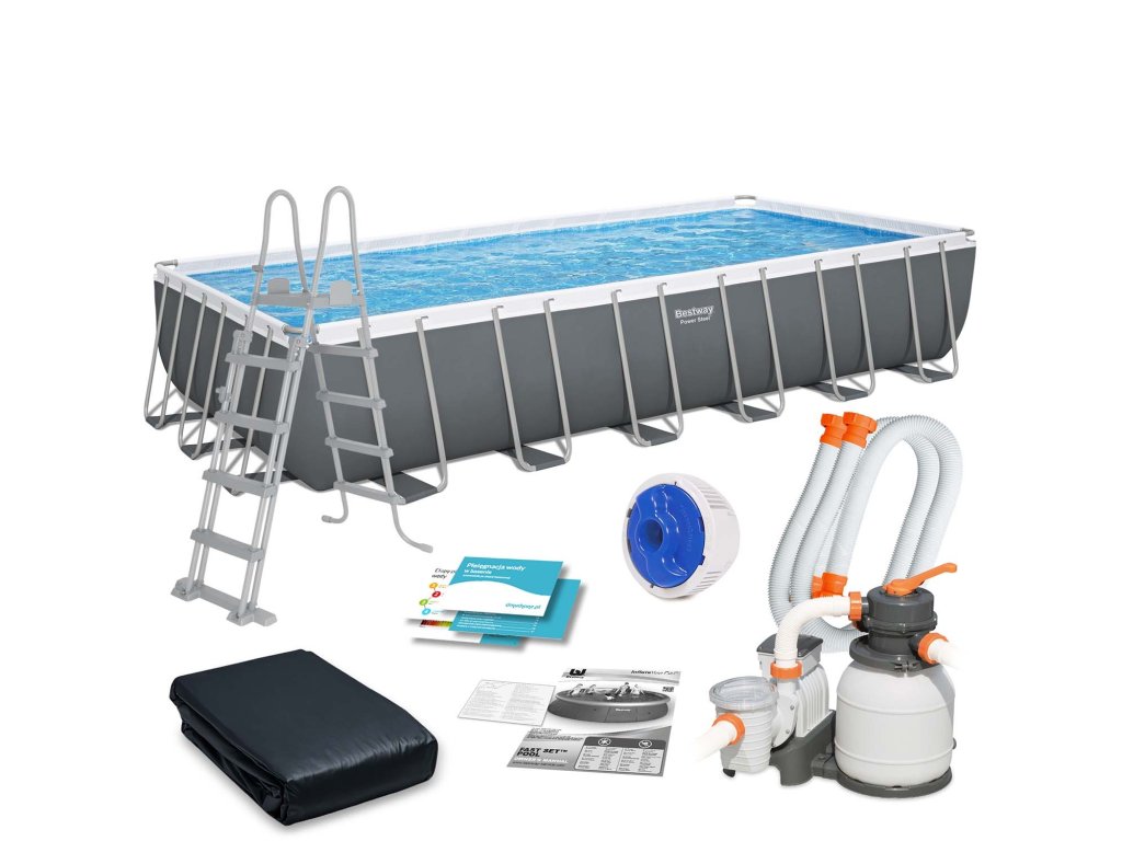- 732 x 366 x 132 cm SzűrőszivattyúBiztonságos létrákMedencetakaróVegyszer adagolóSzűrő a szivattyúhozSzivattyú rögzítőkTömlők a szivattyúhozJavító foltKézikönyv lengyel nyelvenHasználati útmutató - letölthető az aukcióból