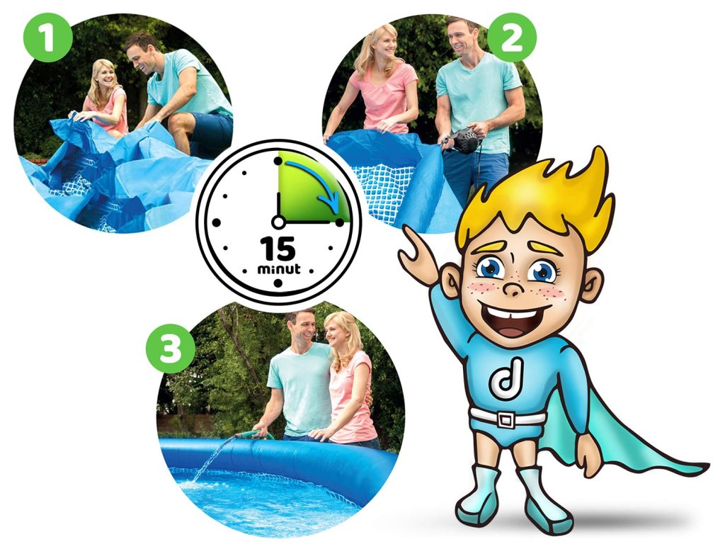 Mesebeli medencegyerekjáték az összeszerelése, és használatra kész néhány pillanat alatt.