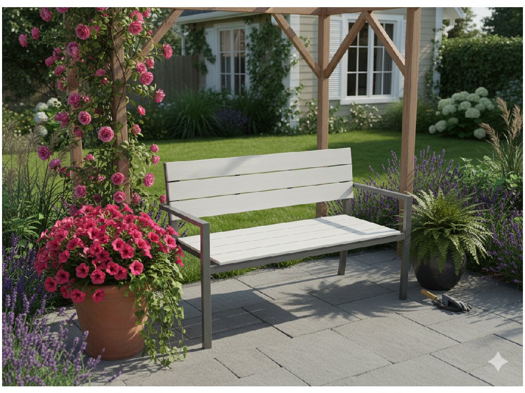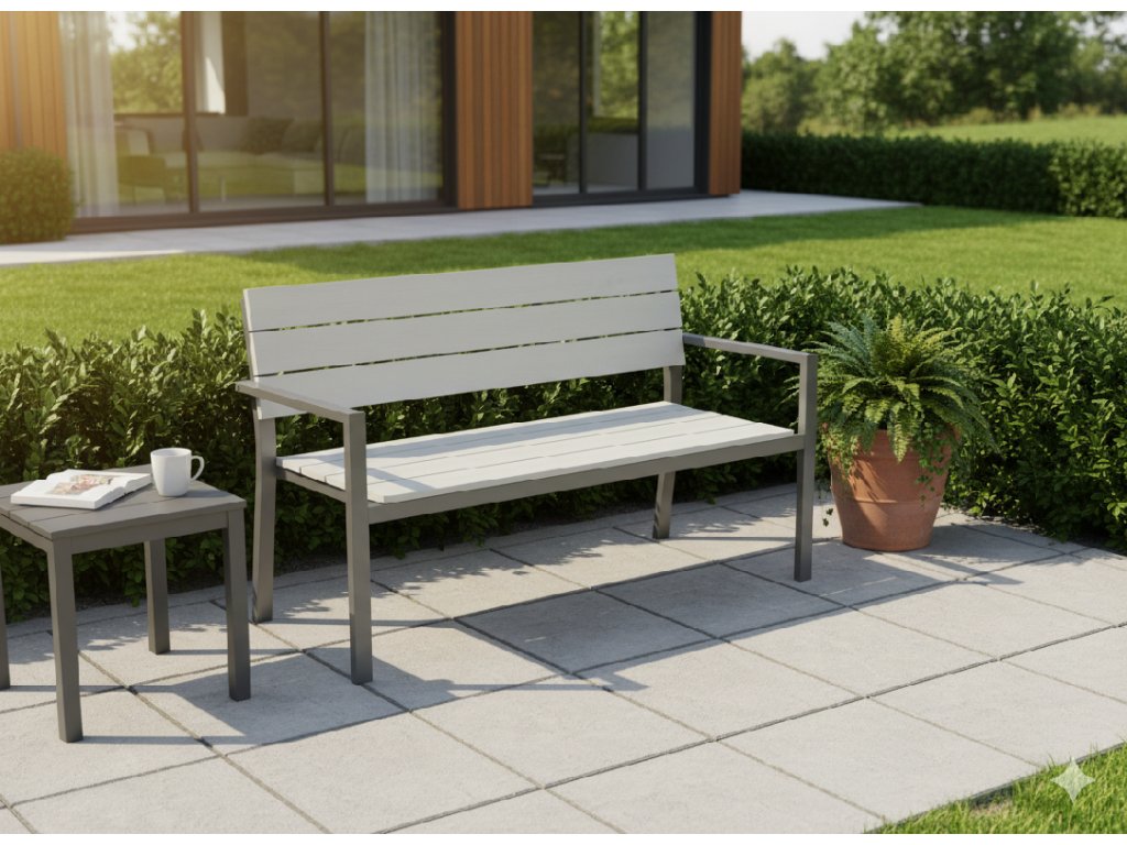 A GARDEN LINE sorozat szép és praktikus kerti padja nélkülözhetetlen eleme minden kertnek. Kiválóan illik vízi elemekhez, szökőkutakhoz és egyéb kerti dekorációkhoz. Ideális megoldás a pihenés és a friss levegőn való délutáni olvasás szerelmeseinek. A kényelmes háttámla és ülés műanyag lamellákból készült, amelyek fa hatásúak, biztosítják a kényelmet, a fémváz pedig stabilitást és tartósságot garantál.