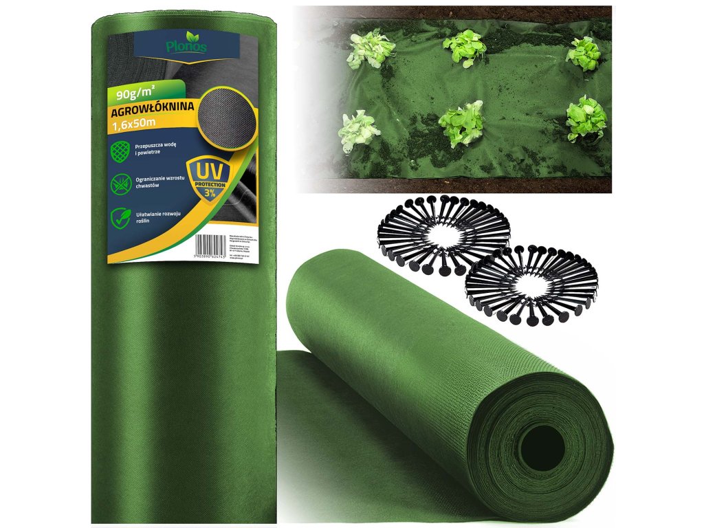 Kerti textília 1,6 m x 50 m 90 g/m2 + 100 tüske Plonos - zöld