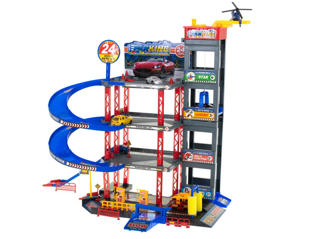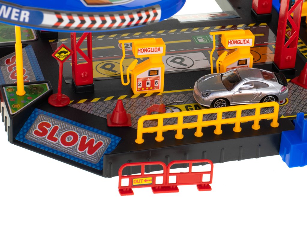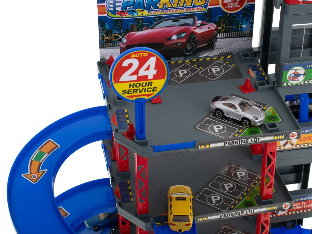 A parkolóhoz sorompóval ellátott liften keresztül juthatunk el. A lift a következő emeletre visz. Parkoljon a tetején, és nézze meg, milyen gyorsan jut le a kisautó.