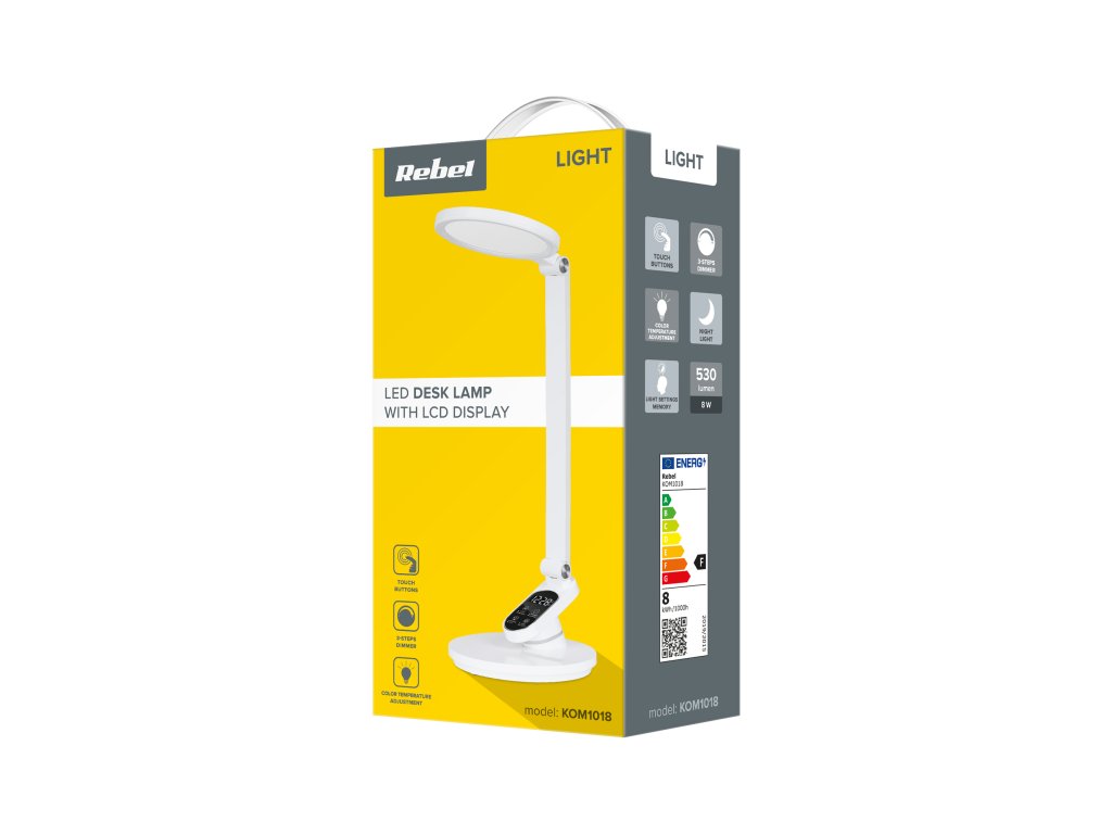 a Rebel KOM1018 asztali lámpa kijelzővel egy modern eszköz, amely ötvözi a funkcionalitást és az esztétikát, és kellemes hangulatot teremt a gyerekszobában .Nagyszerű szolgálatot tesz az íróasztalon vagy az éjjeliszekrényen, megvilágítja a teret tanulás vagy könyvek olvasása közben.
