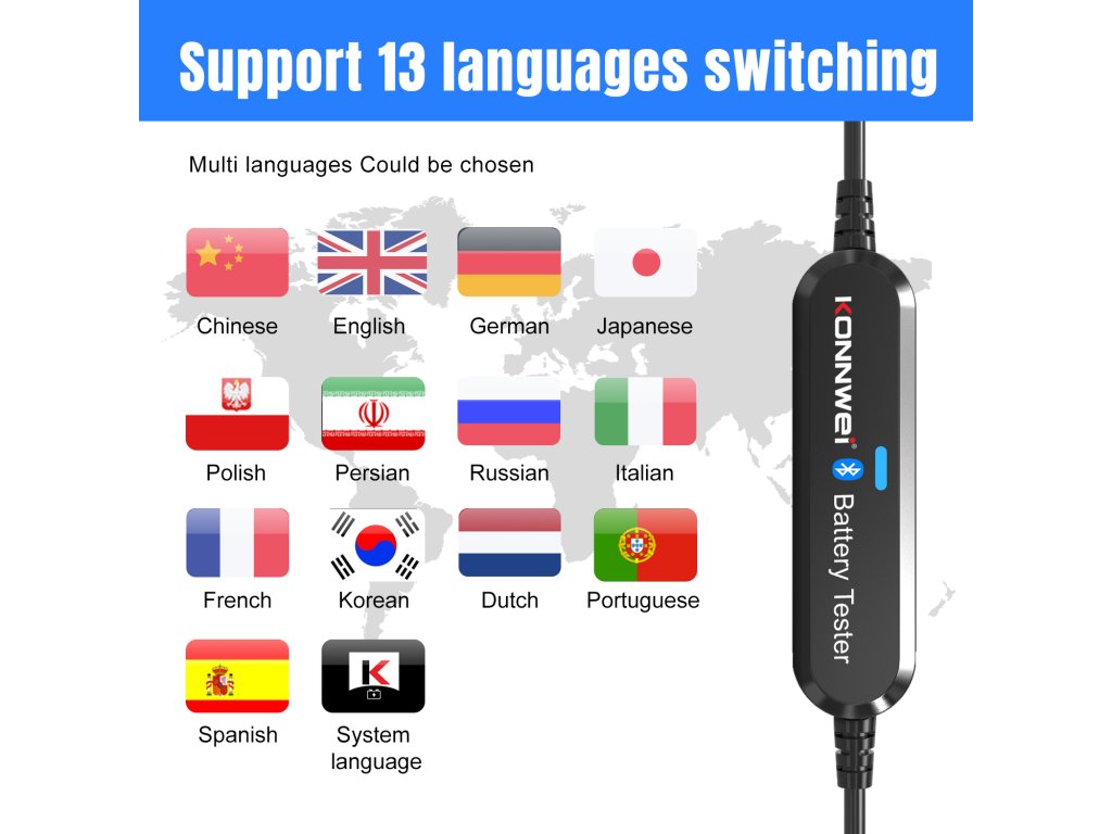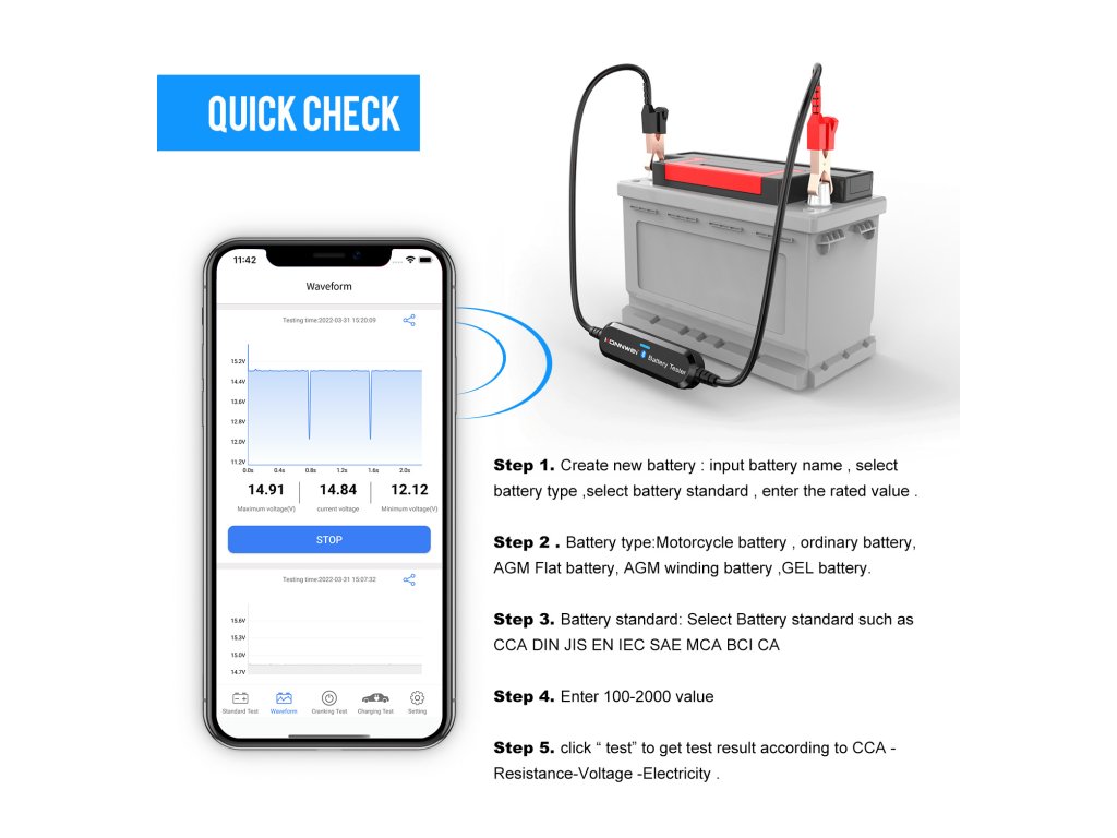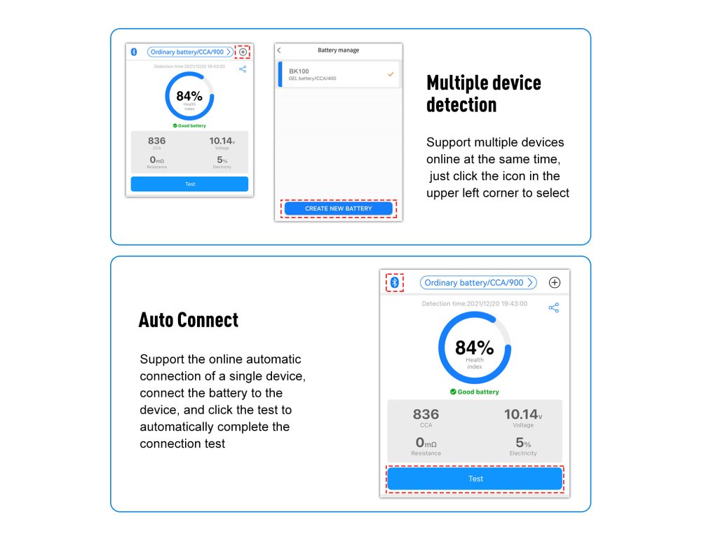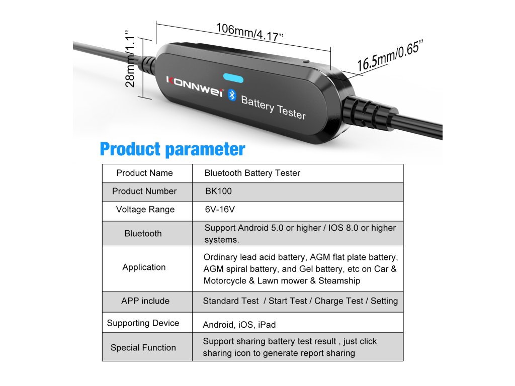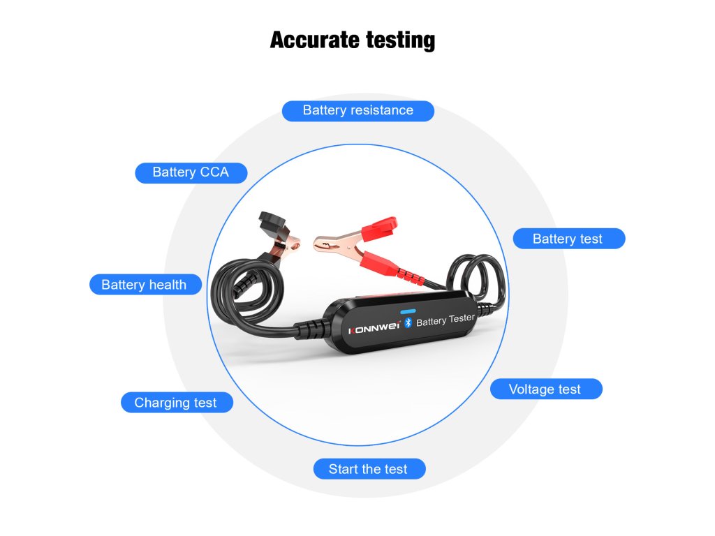 Afejlett Bluetooth technológiának köszönhetően a Konnwei akkumulátortesztelő lehetővé teszi az akkumulátor állapotának átfogó elemzését .Ellenőrizheti az akkumulátor általános állapotát, elvégezheti az indítási tesztet, és szorosan nyomon követheti a töltési folyamatot .A tesztelő pontos adatokat szolgáltat a feszültségről, a belső ellenállásról, a hidegindítási képességről, az akkumulátor állapotáról és a töltés állapotáról.