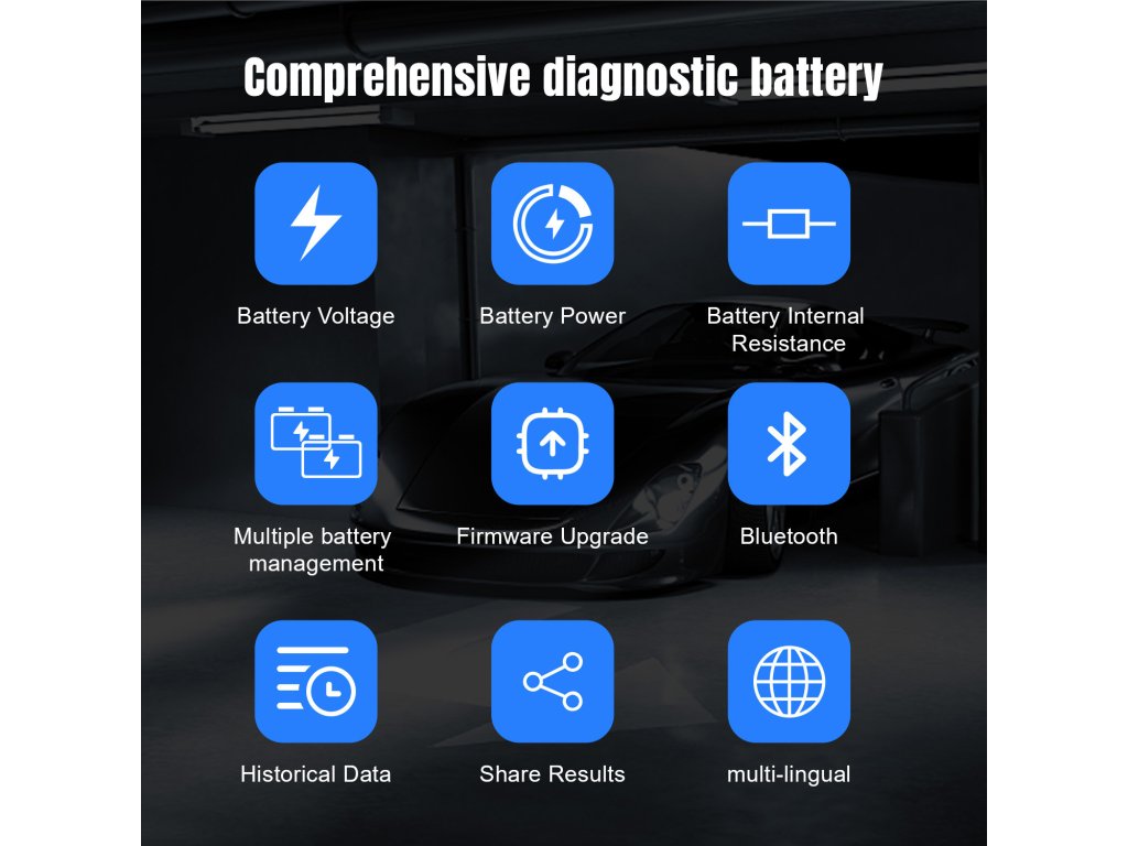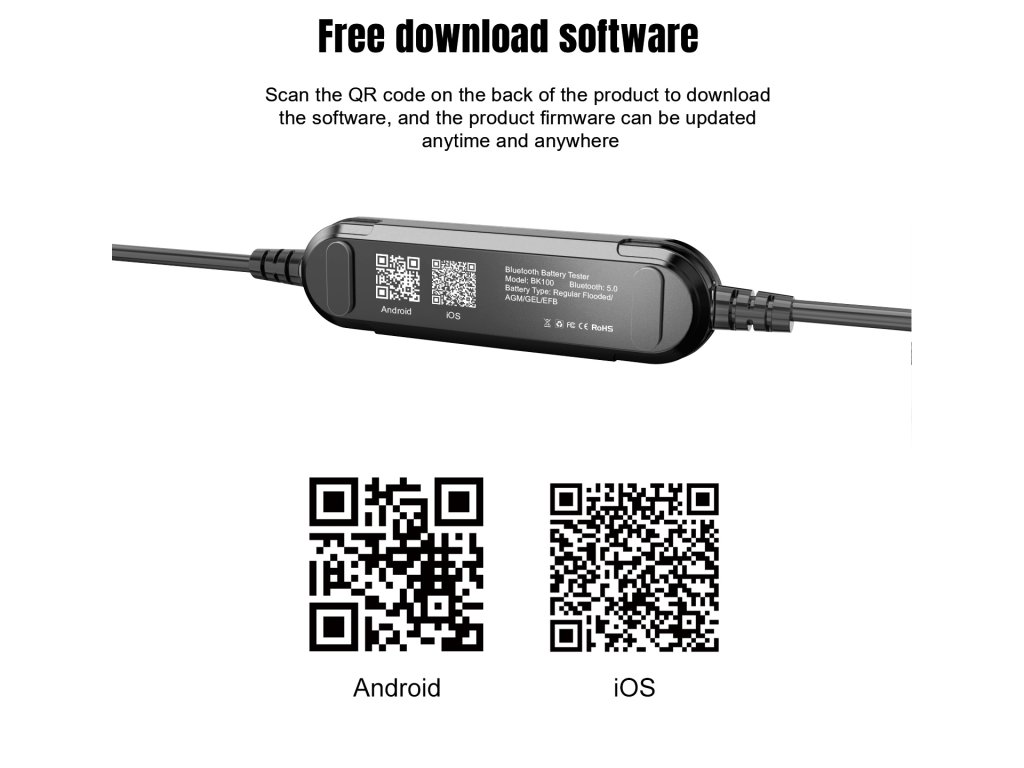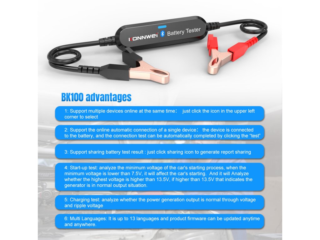Emelje autója ellenőrzését és biztonságát a következő szintre. ABK100 egy innovatív autóakkumulátor tesztelő készülék . Alegújabb Bluetooth technológiát használja az autóakkumulátor állapotának megállap ítására.Ez azt jelenti, hogy többé nem kell az autója előtt állnia és várnia a teszt elvégzésére .Miután az akkumulátor csatlakozik a készülékhez, megnyithatja az alkalmazást a telefonján vagy tabletjén, és kényelmesen elvégezheti a tesztet.