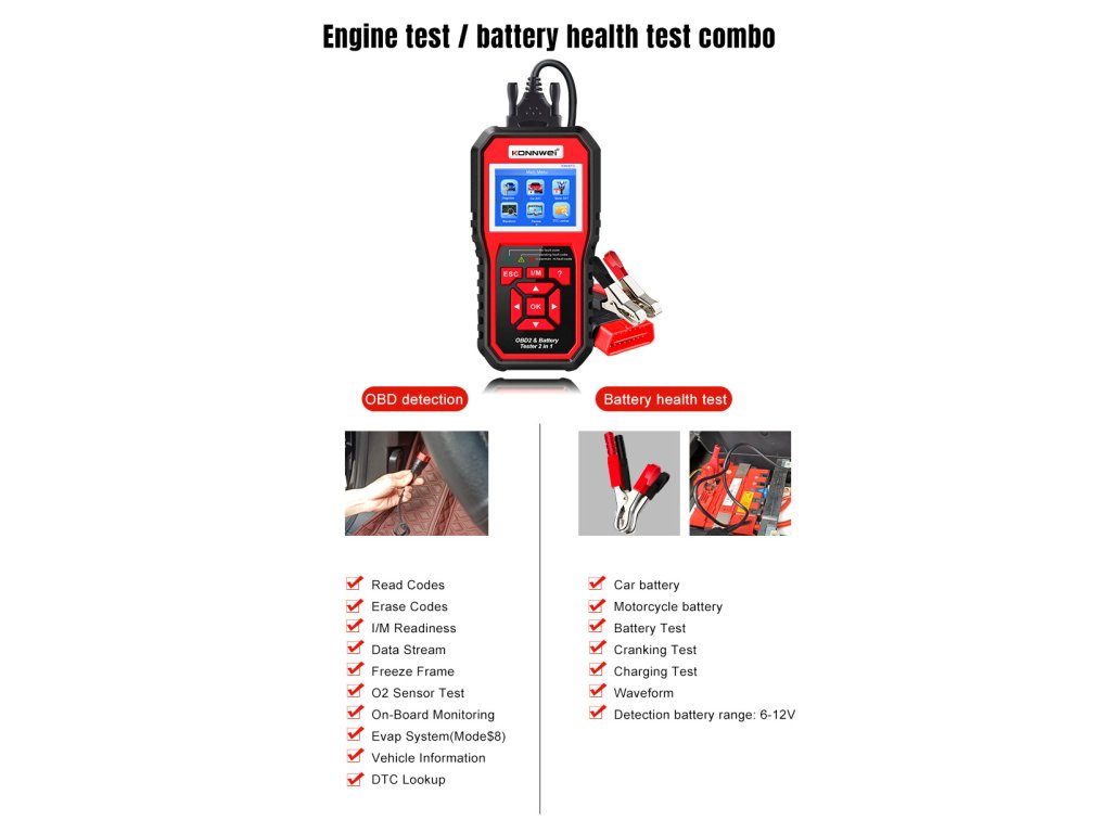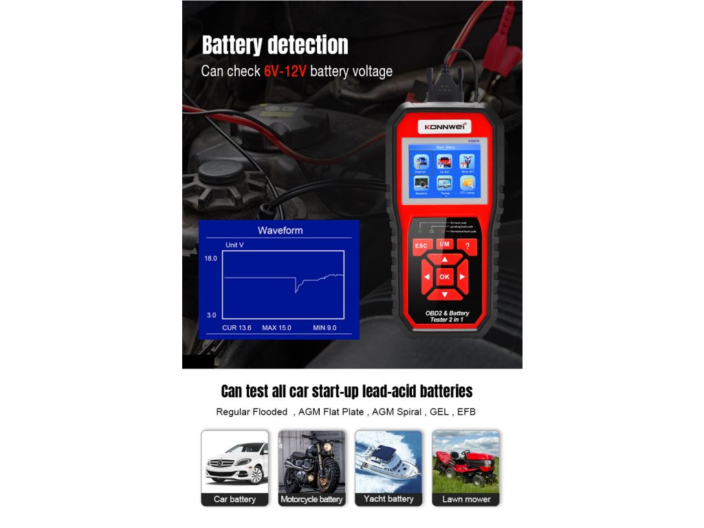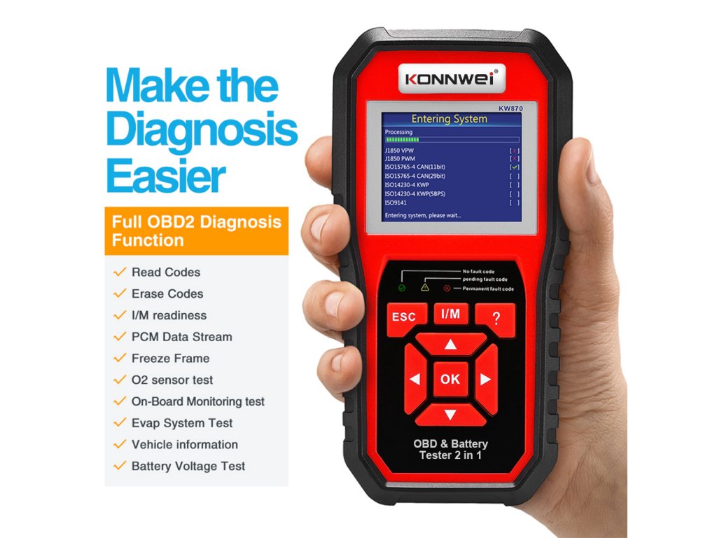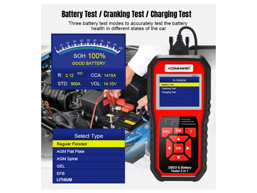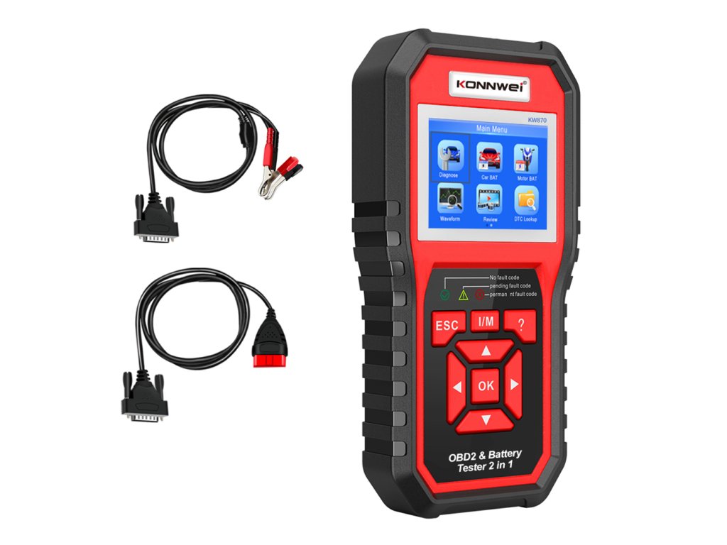 Konnwei KW870 OBD2 autódiagnosztika + autó akkumulátor tesztelő
