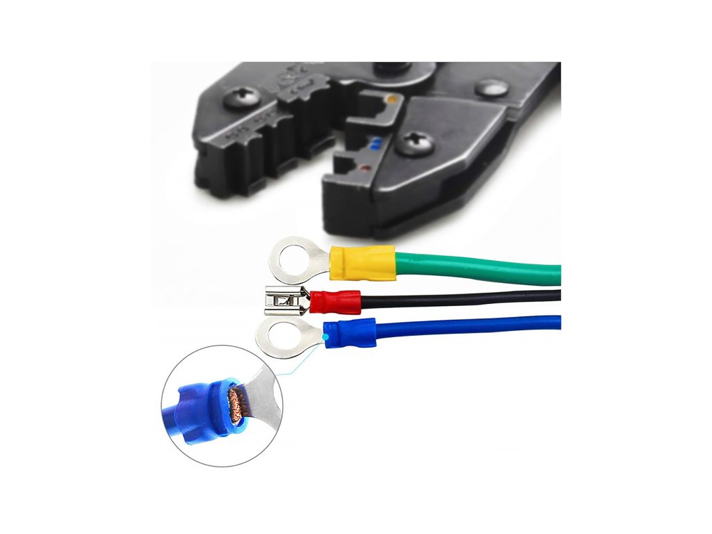 Csatlakozó készlet 700 darab + krimpelő szerszám A krimpelő szerszámból és 700 kábelsarukból álló robusztus készlettel gyorsan és pontosan elkészíthetők az elektromos vezetékek. A nagy krimpelési tartományra tervezett (három színkódolt méretű krimpelőpofa) szerszám kuplungos mechanizmussal van felszerelve, amely kevés erőt igényel és biztosítja a helyes krimpelést. A kábelvégek és a krimpelőpofák méretének színkódolt jelölése megkönnyíti a munkát. A szabványos kábelsarkok jól áttekinthetően vannak szortírozva egy praktikus tárolóedényben.