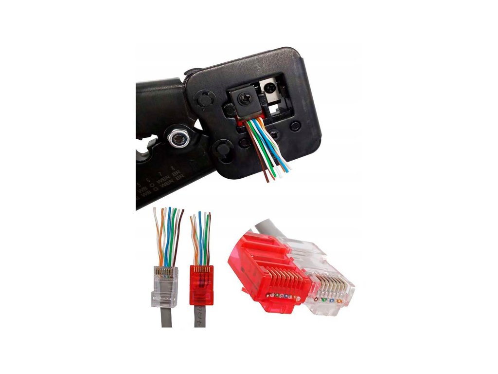 Ezzel az eszközkészlettel számítógépes hálózatokat építhet a Pass Through technológiával, amely lehetővé teszi a teljes kábel áthúzását a csatlakozón keresztül, ezáltal jobb és pontosabb csatlakozó sajtolást biztosítva.Főbb jellemzők és alkatrészek: