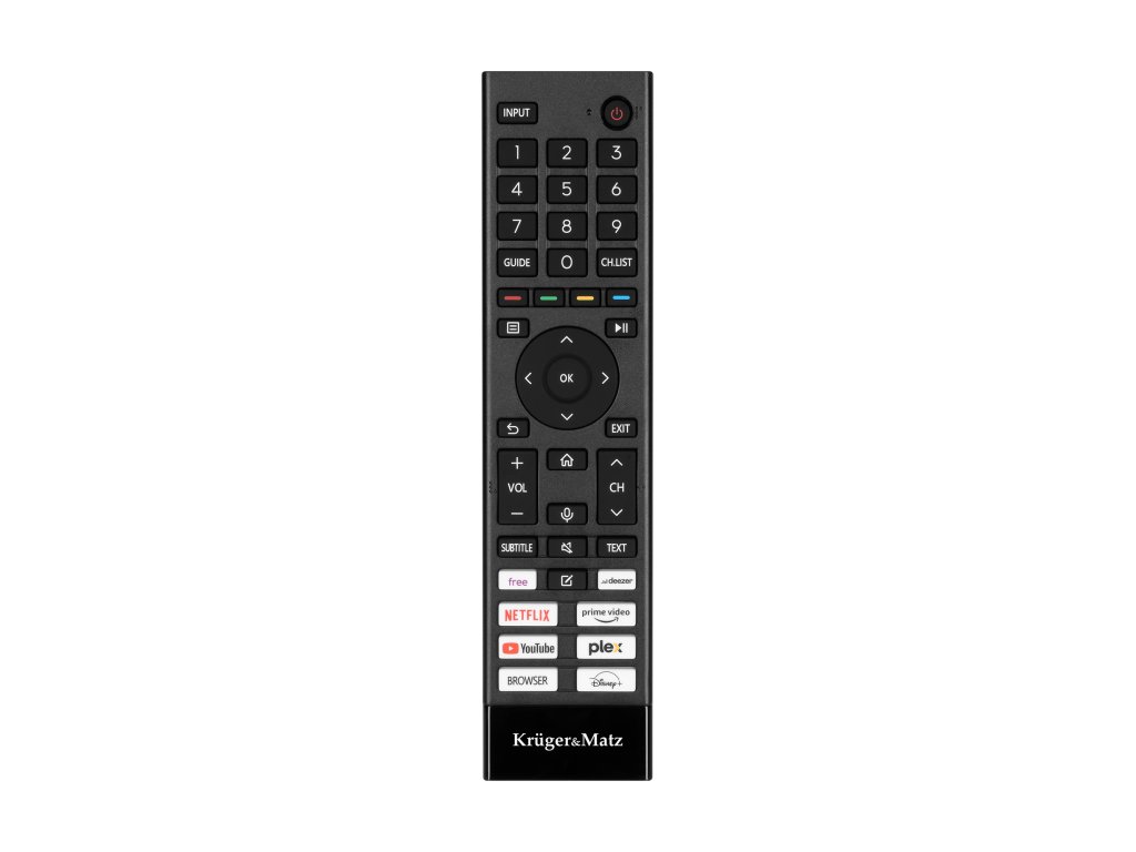 A Kruger&Matz televízióhoz mellékelt távirányító a kényelmes és intuitív használat érdekében lett tervezve. A távirányítón gyorsgombok találhatók a legnépszerűbb alkalmazásokhoz, mint például a Netflix, YouTube vagy az Amazon Prime Video. Ezeknek köszönhetően gyorsan elindíthatja kedvenc tartalmait a menük böngészése vagy az alkalmazások keresése nélkül. Többet is tud