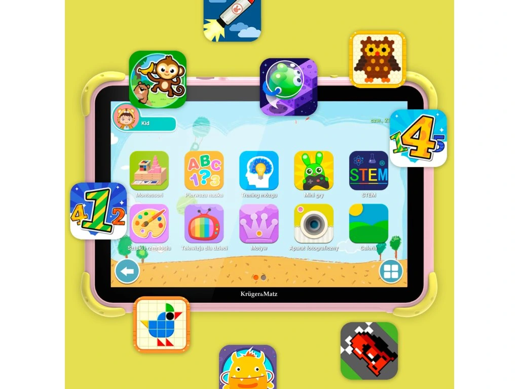 A gyerekeknek szánt tableteknek nemcsak tartósnak kell lenniük, hanem olyan érdekes dizájnnal is kell rendelkezniük, amely távolról is felkelti a figyelmet. Ennek érdekében a Kruger&Matz FUN 1008 színes burkolata gumisarkokkal van ellátva, amelyek védelmet nyújtanak a véletlen leejtések és ütődések ellen.