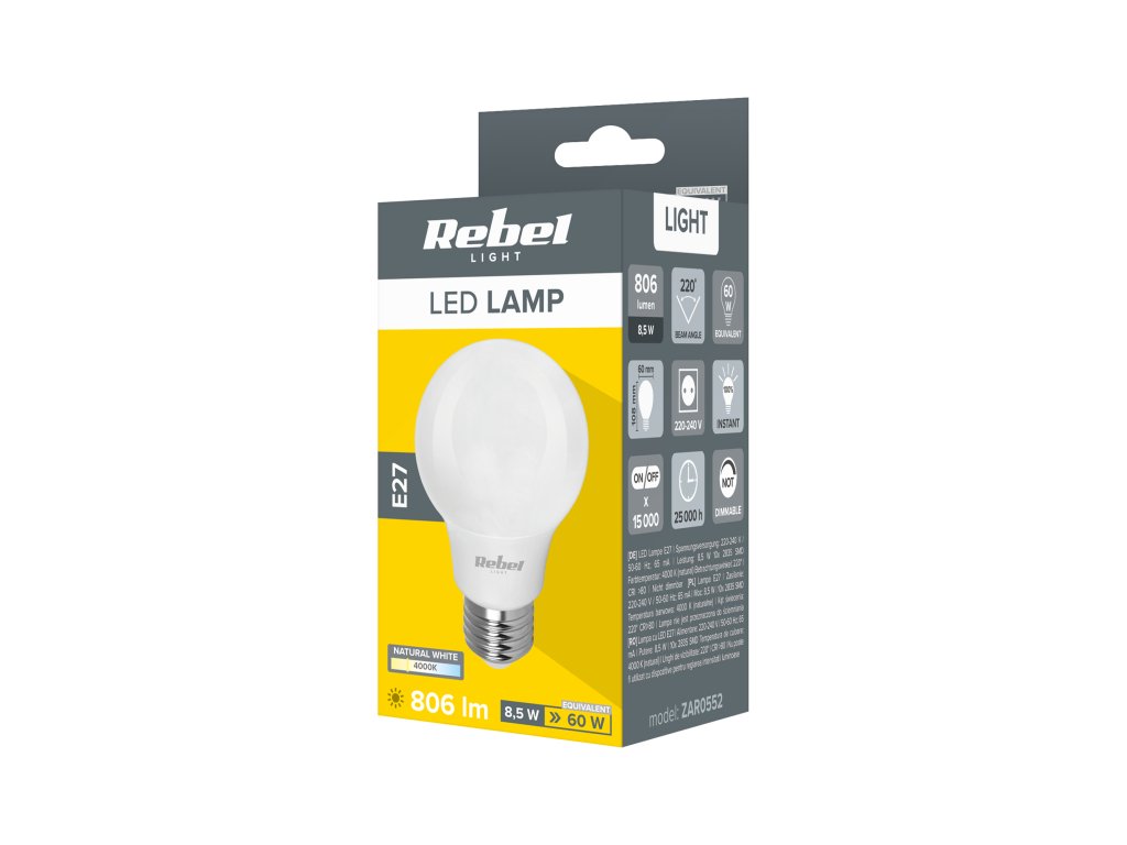 LED izzó E27 8,5W 4000K 230V ZAR0552Műszaki paraméterek: