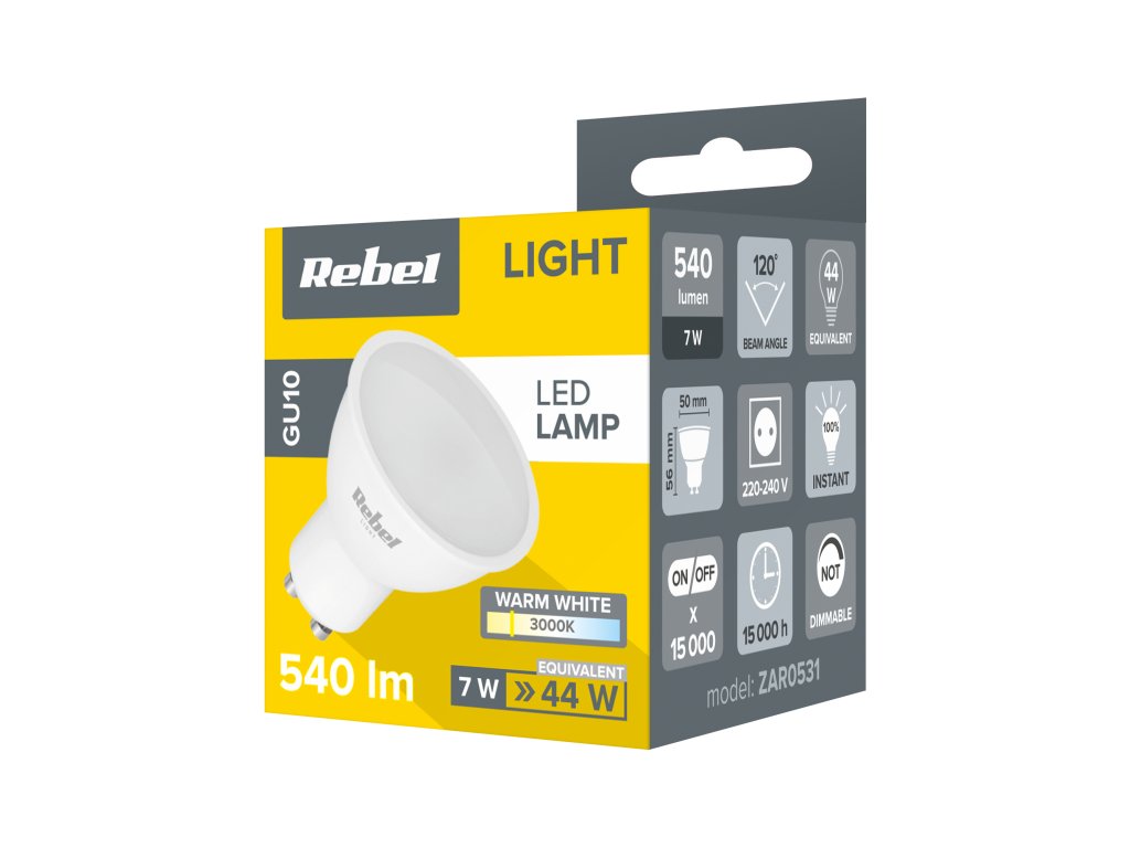 a Rebel sorozat 7 W-os és 540 lm-es LED-lámpája nagy hatékonyságot és alacsony energiafogyasztást garantál. Hosszú élettartam és széles, 120 fokos megvilágítási szög jellemzi melegfehér színben. A Rebel LED-lámpa a G energiaosztályba tartozik, és megfelel az Európai Bizottság legújabb, a fényforrások energiacímkézésére vonatkozó előírásainak, valamint a fényforrások környezetbarát kialakítására vonatkozó követelményeknek.