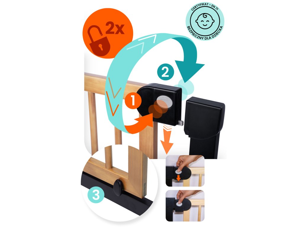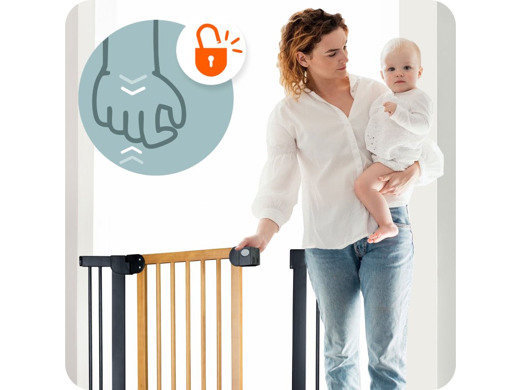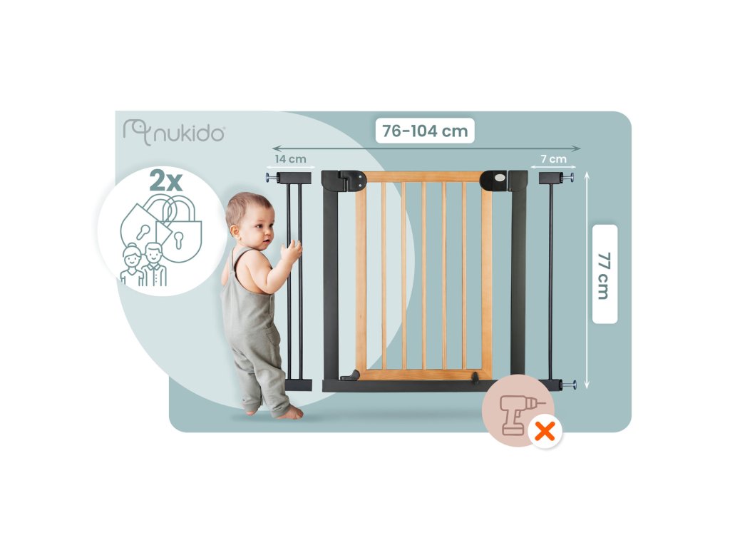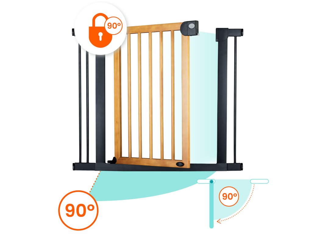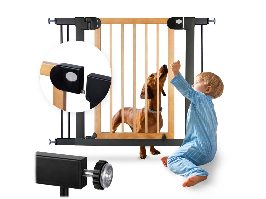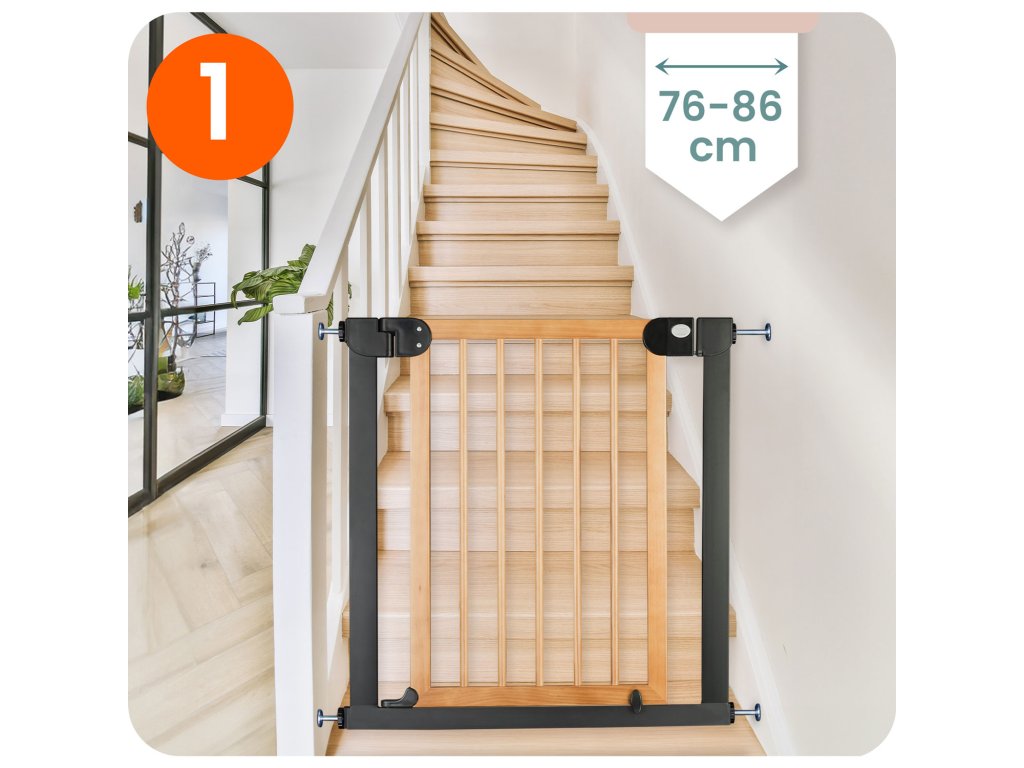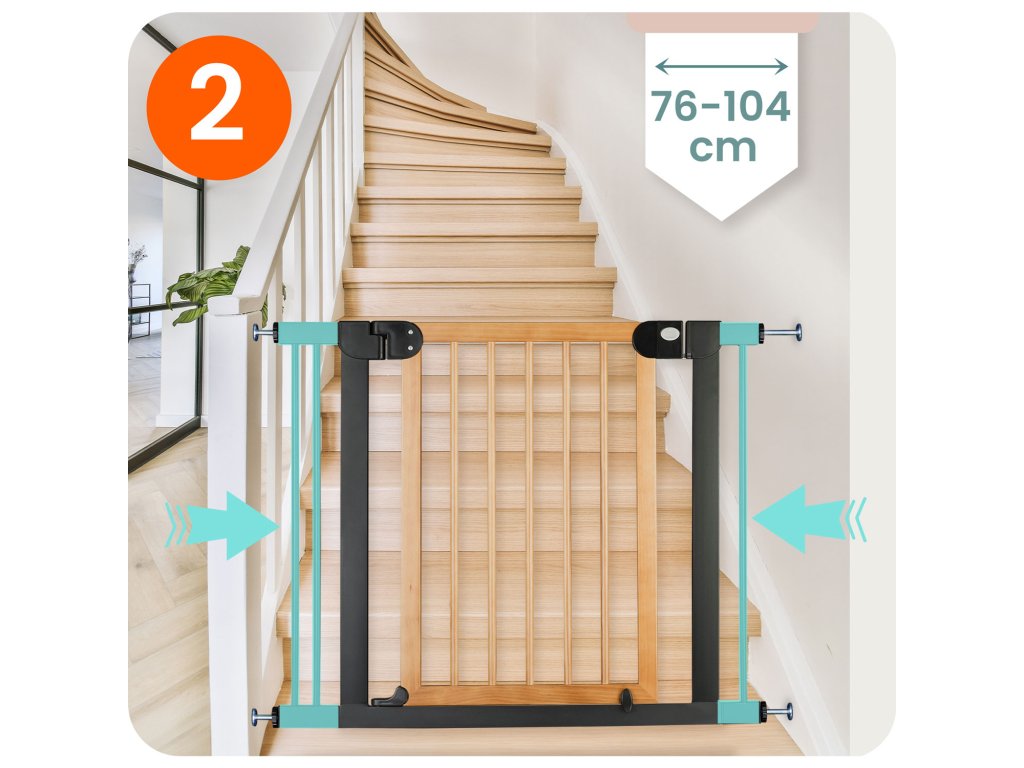 A bővíthetőségnek és a rögzítési rendszernek köszönhetően a kapu 76 cm-től 104 cm-ig terjedő méretű átjárókhoz igazítható.