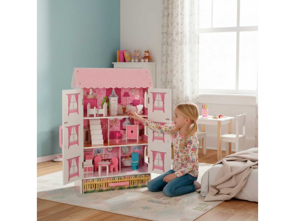 A varázslatos stílusban készült nyitható baba ház nemcsak kreatív játék helyszíne lesz, hanem a gyerekszoba dísze is. A házikó három emeletes, melyek között megtalálható a konyha, a fürdőszoba, a hálószoba, a nappali és a lépcső. A mágneszárral záródó ajtók és fiókok segítenek rendet tartani a szobában - a játékok a játék után könnyen elpakolhatók benne.