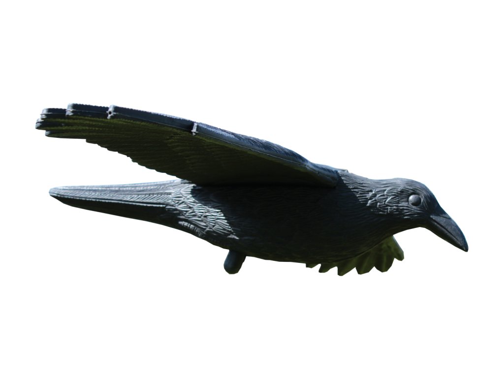 A nagy madárriasztó, amely holló formájában készült, hatékony és látványos védelmet nyújt a kertnek, területnek, gyümölcsösnek vagy erkélynek. A valósághű megjelenés és impozáns méret a ragadozó jelenlétét utánozza, távol tartva a madarakat, mint például a galambokat, a seregélyeket vagy a verebeket. Ideális használatra nagyobb nyitott terekben.