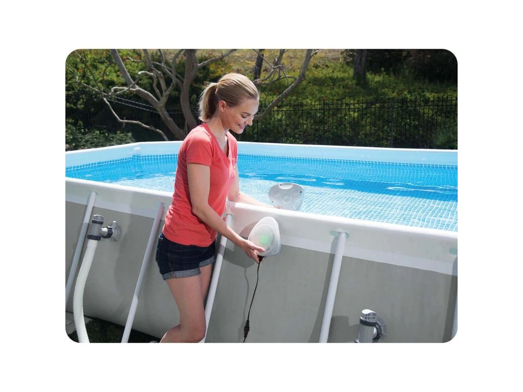 A bemutatott medencelámpa az Intex egyik legújabb tervezése. Mágneses tulajdonságainak köszönhetően biztonságosan képes áramot vezetni. Ez áthatol a medence falain a belső LED-lámpákhoz. Érdemes megemlíteni, hogy ez a lámpa több fényt biztosít, mint egy hagyományos 50 wattos izzó, így akár 7,32 méteres távolságig is megvilágítja a medencét. A lámpába szerelt LED diódák több színben is világíthatnak (zöld, tengerzöld, kék és lila), és a különféle világítási módok lehetővé teszik a színek közötti gördülékeny átmenetet.