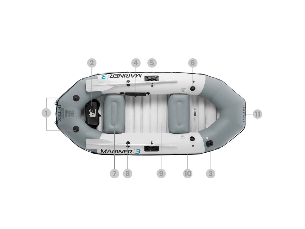 - Gumi erősítés az elején hatékonyan védi a csónakot a sziklákkal vagy faágakkal való harmadik fokú érintkezéstől , a 3 kamrás rendszer pedig lehetővé teszi, hogy partot érj még akkor is, ha az egyik megsérülne.