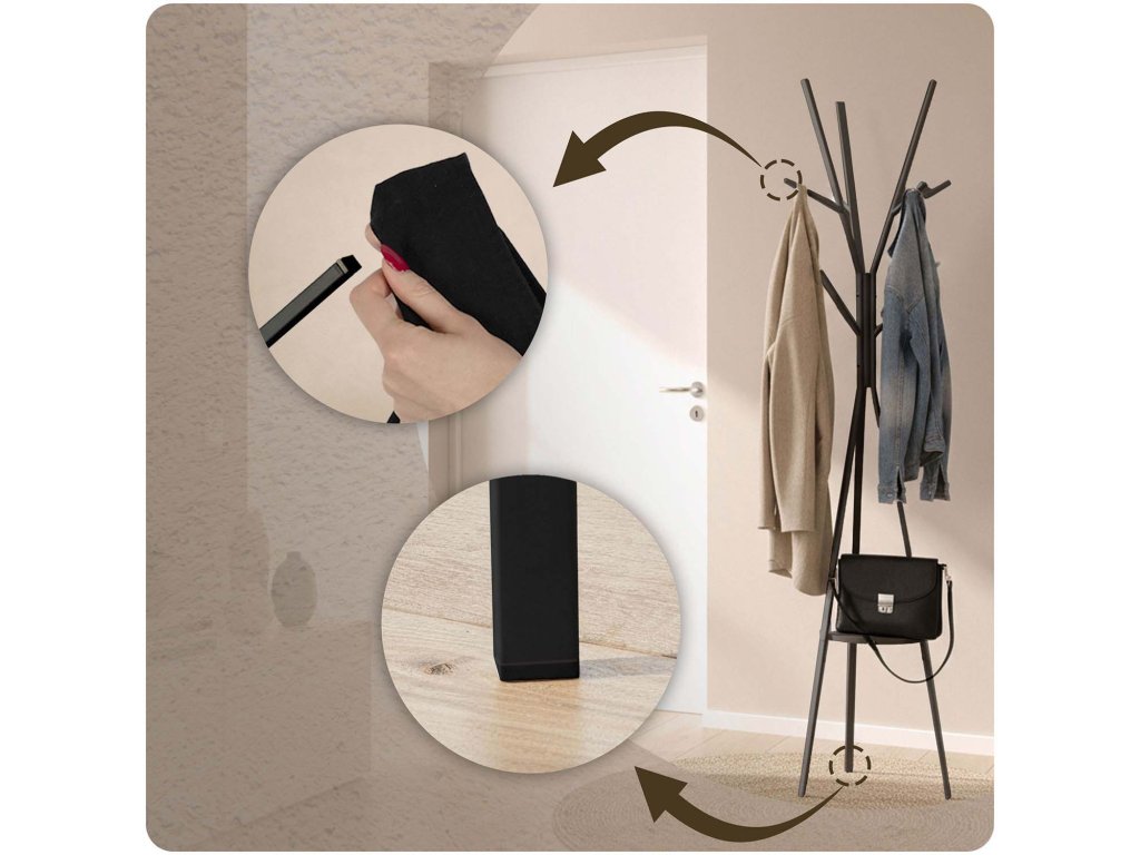 Az akasztók és a lábak zárókupakokkal vannak ellátva, amelyek megóvják a padlót a karcolásoktól és a ruhákat az érdességektől.