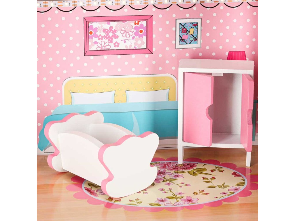 MDF fából készült babaház + bútor 70cm rózsaszín LED