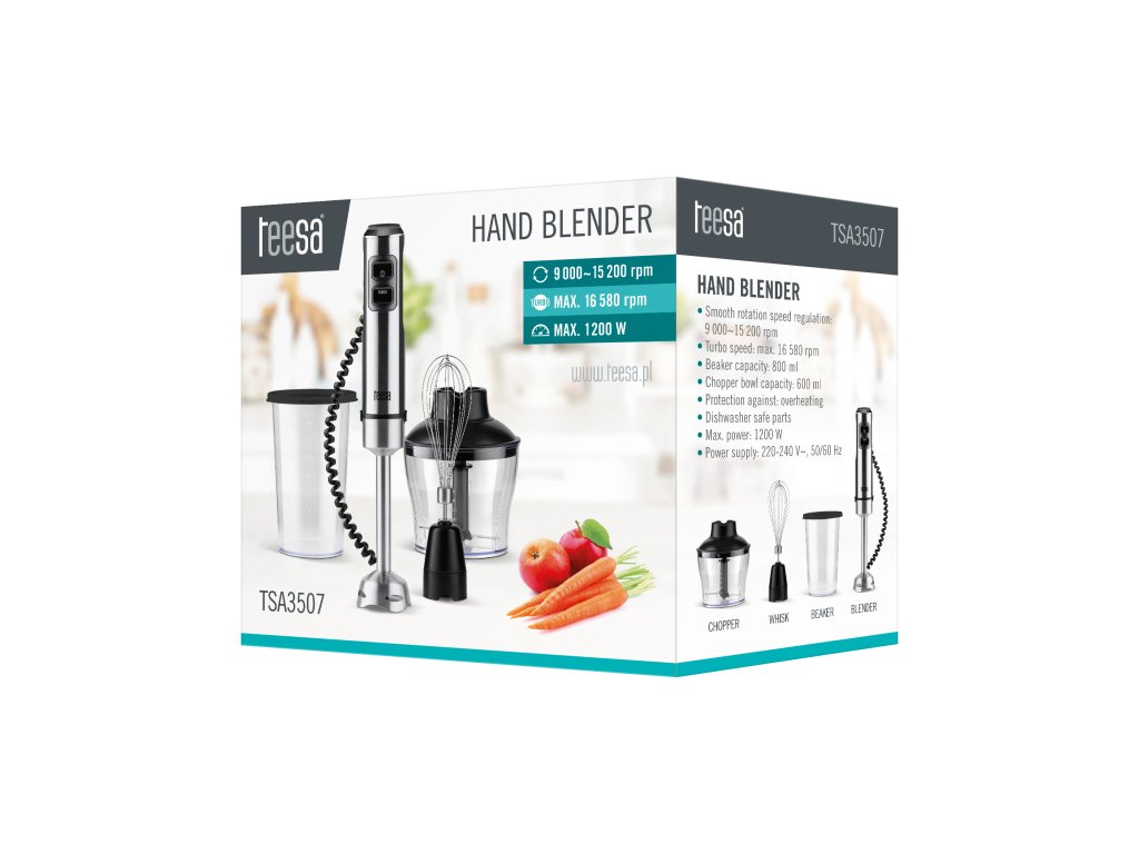 A turmixgép olyan készülék, amely egyetlen konyhából sem hiányozhat. A Teesa TSA3507 egy olyan szett, amely a klasszikus keverőhegy mellett tartalmaz egy aprítót és egy habverőt is. Ezzel nemcsak frissítő turmixokat és egészséges krémleveseket készíthet, hanem zöldségeket apríthat salátákhoz, és tejszínhabot verhet desszertekhez. Hozza ki a legtöbbet a Teesa turmixgépéből - és ez az 1200 W-os teljesítményével sok mindenre képes!