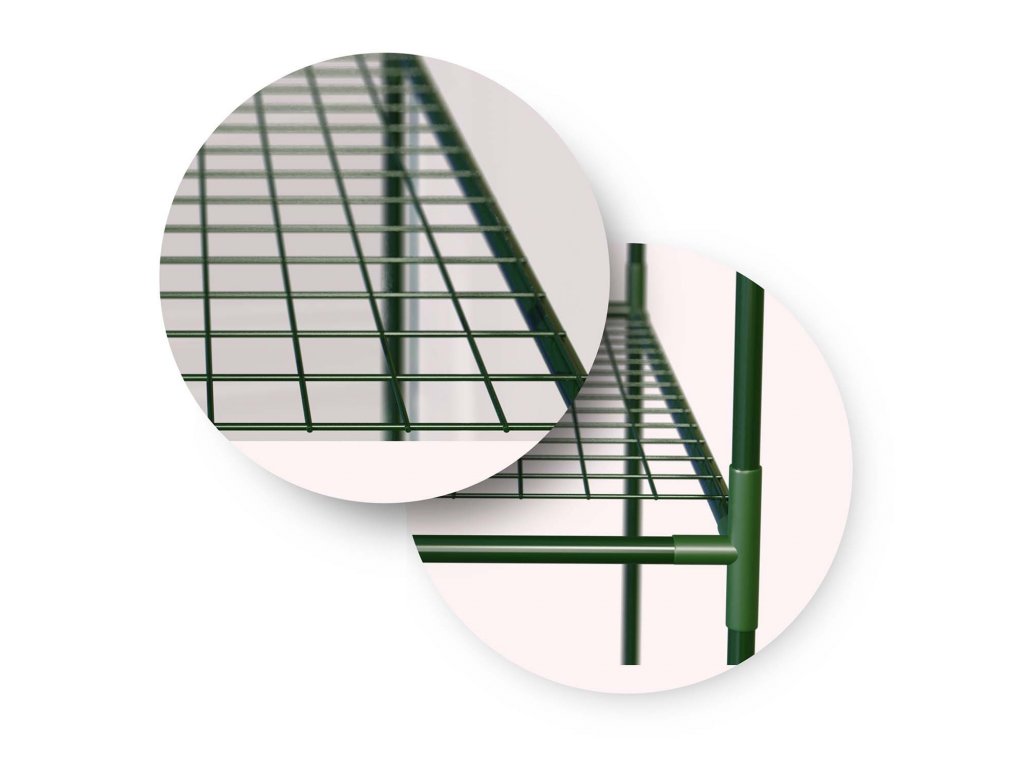A polcok alatti hely használható kiegészítők - cserepek, gereblyék stb. számára.