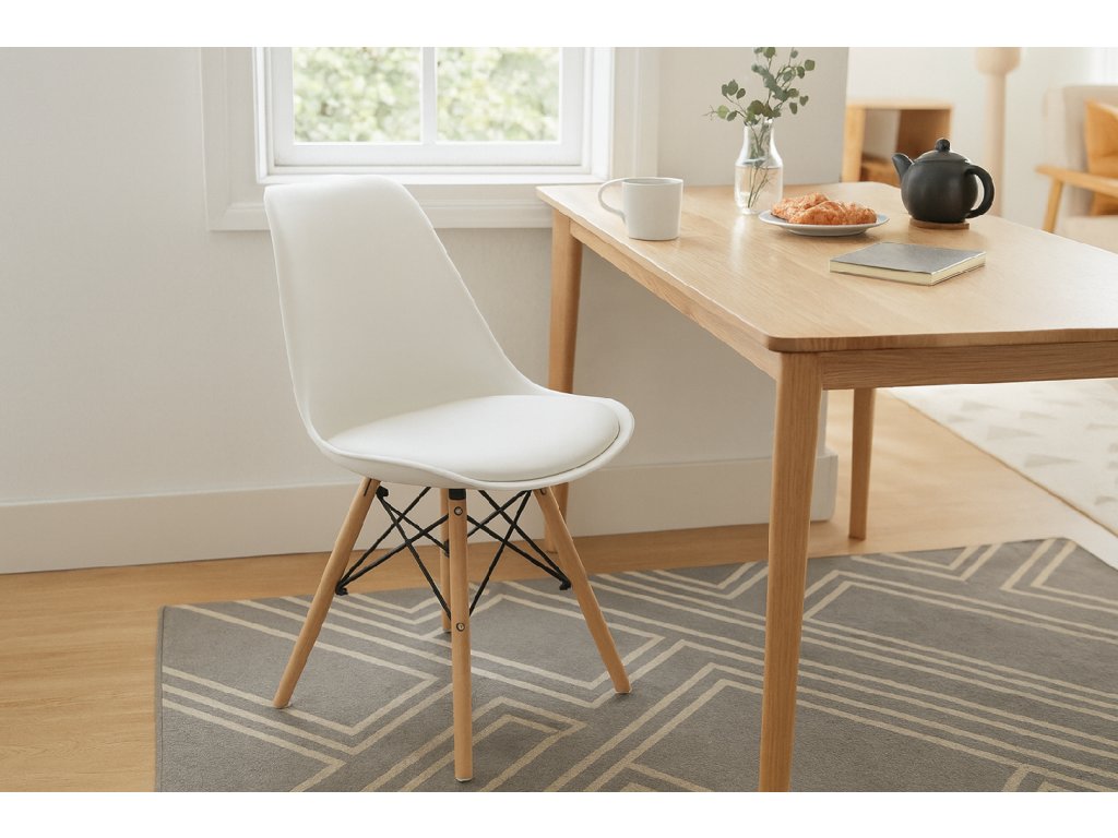 Modern fehér műanyag szék párnázott fa lábakon. Ötvözi a minimalista dizájnt, a kényelmet és a tartósságot. Ideális étkezőbe, konyhába, nappaliba, irodába vagy kávézóba. Ergonomikus, stabil és könnyen tisztán tartható.