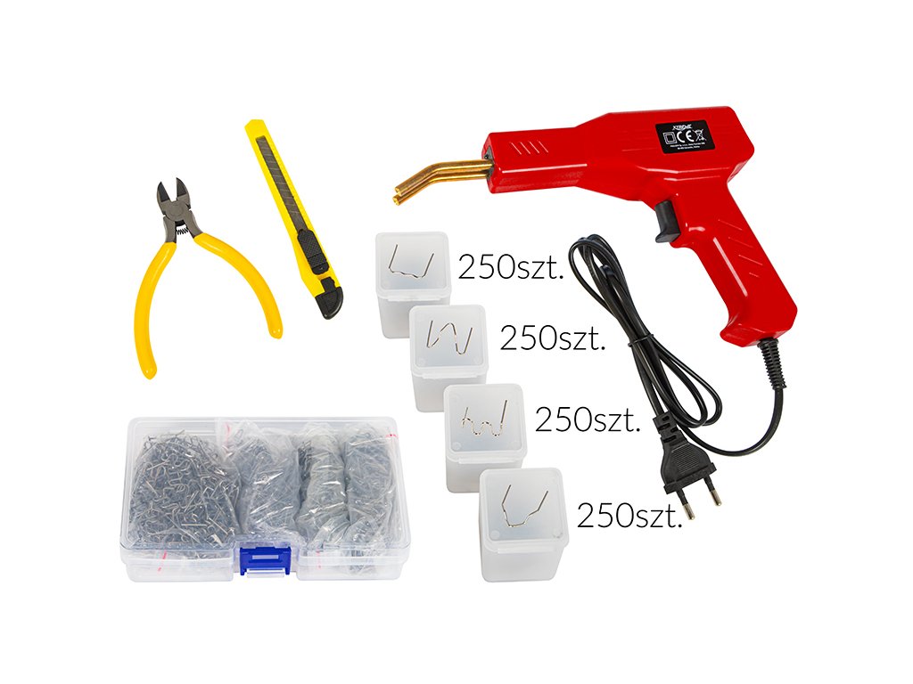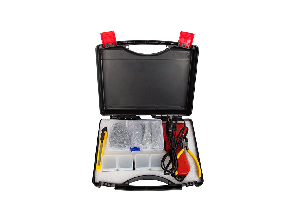 Kompakt műanyag hegesztőgép. A csomagban 1000 darab acél kapocs műanyag anyagokhoz (4 típus, egyenként 250 darab), valamint egy sniccer és fogó a műanyag formázáshoz. Nagyszerű készlet műanyag elemek javításához, műanyag anyagok hegesztéséhez és minden repedés eltüntetéséhez. A szettben emellett hozzáadunk egy praktikus koffert is, amely megkönnyíti az összes elem szállítását és tárolását.