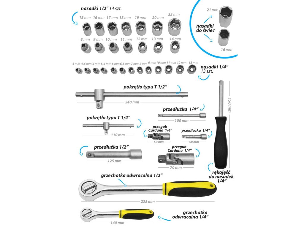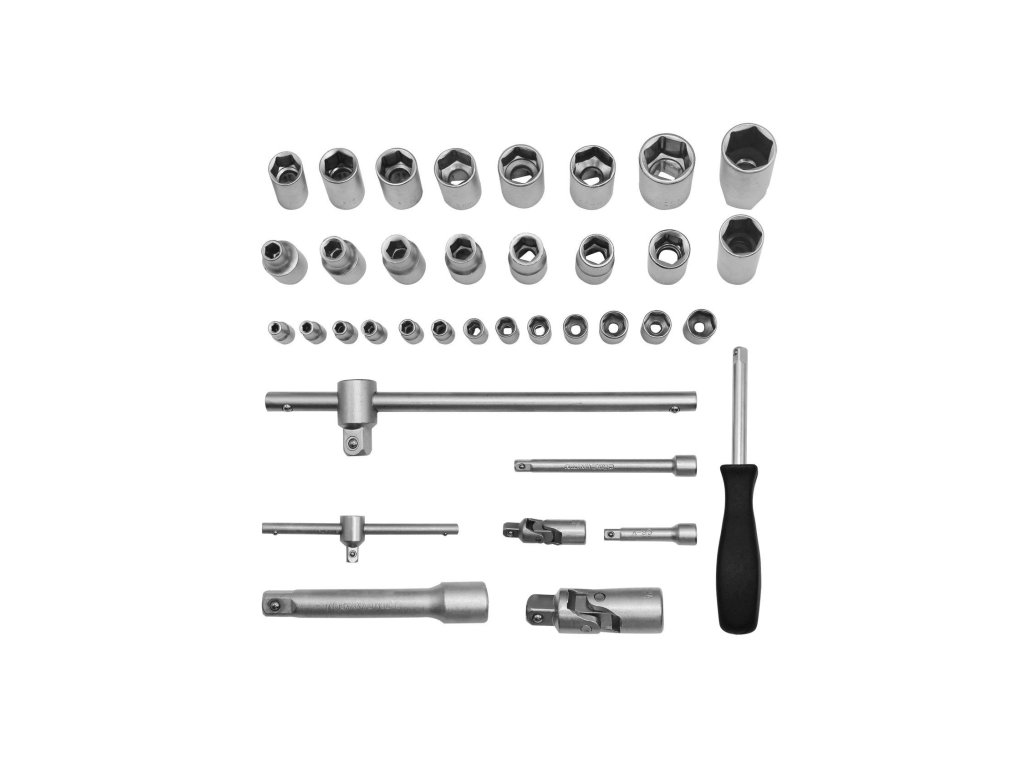 - Kéttengelyes kulcsok – 10 db: 8 mm, 10 mm, 11 mm, 12 mm, 13 mm, 14 mm, 15 mm, 16 mm, 17 mm, 19 mm