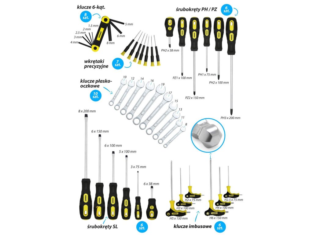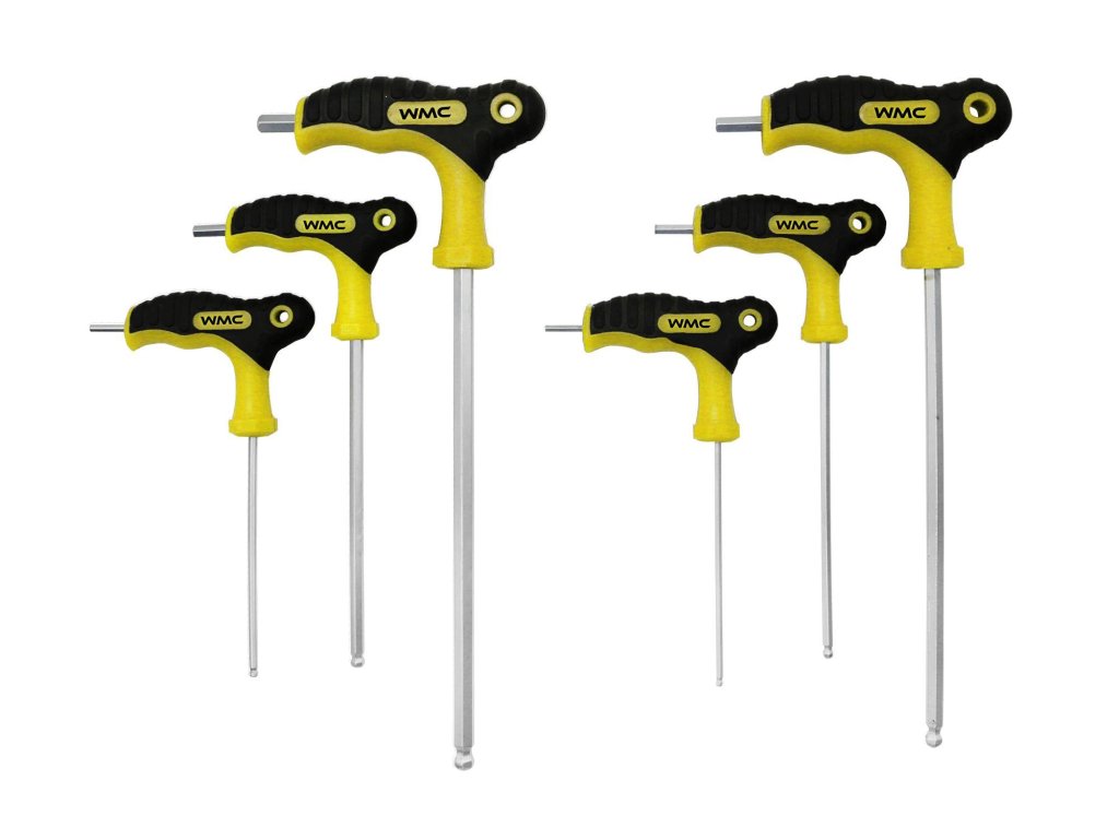 - 6-szögletű T-hajtókulcsok – 6 db: H2x75 mm, H2.5x75 mm, H3x100 mm, H4x100 mm, H5x150 mm, H6x150 mm