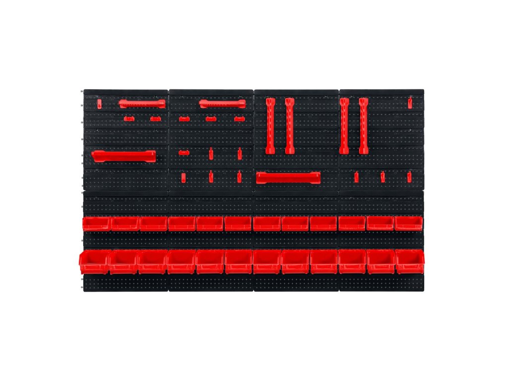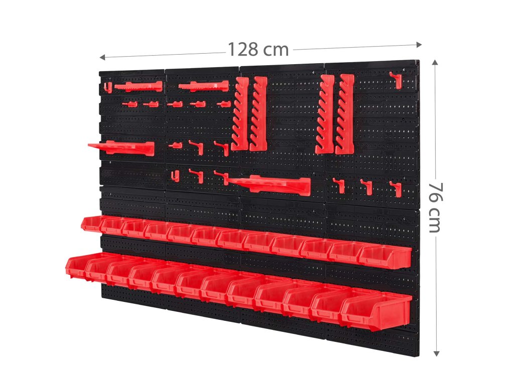 Nagy készlet! 6 perforált moduláris panel és összesen 54 további tartály, tartó, polc és akasztó.